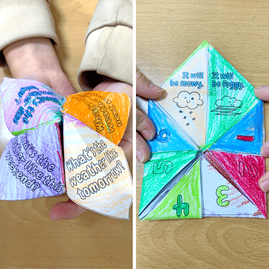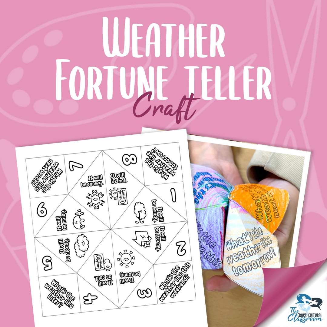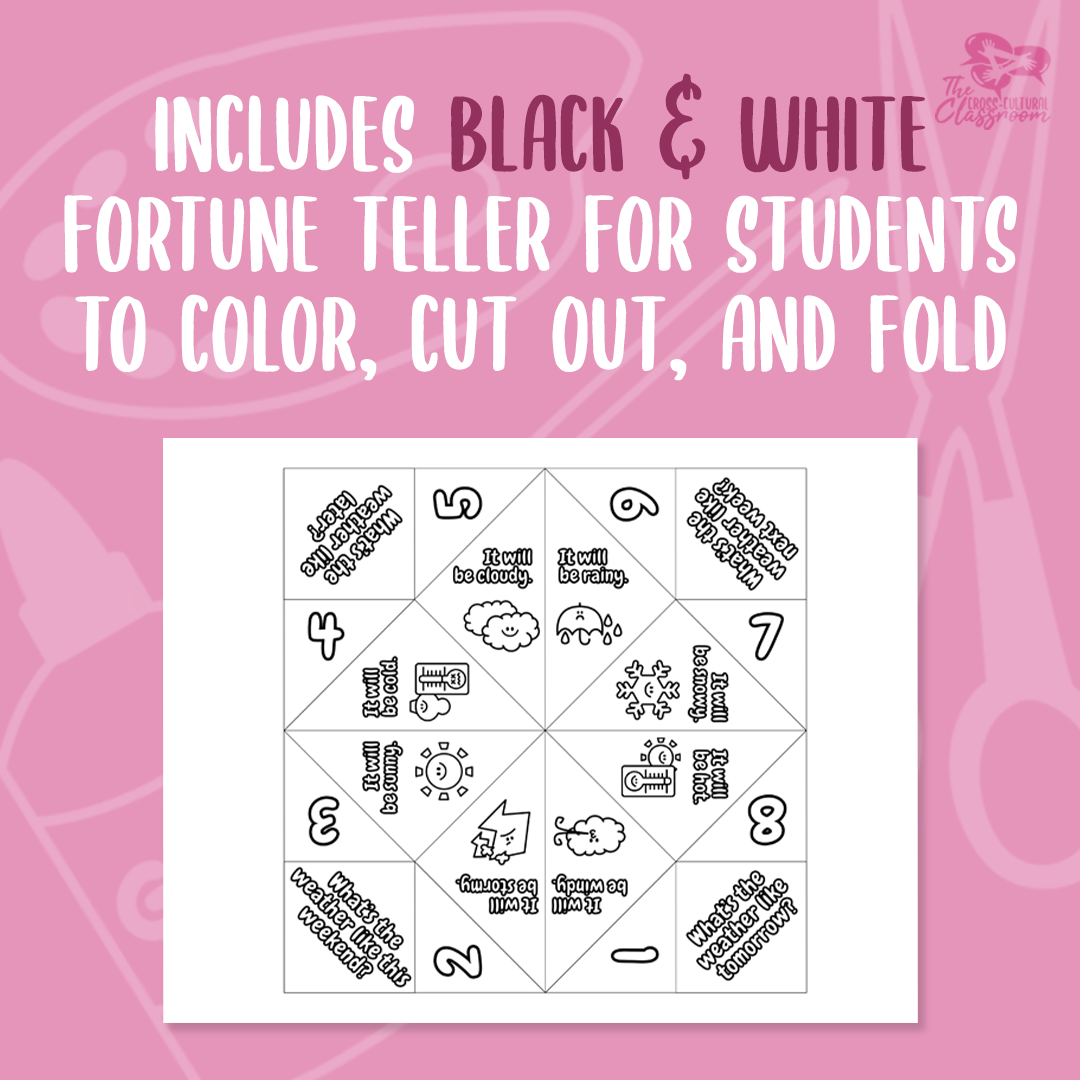 A fun, engaging way to have students practice asking and answering questions about the weather and using the future simple tense! First, students color the fortune teller. Then, they cut it out and fold it. Finally, they go around the classroom and use their projects to ask each other about the future weather!