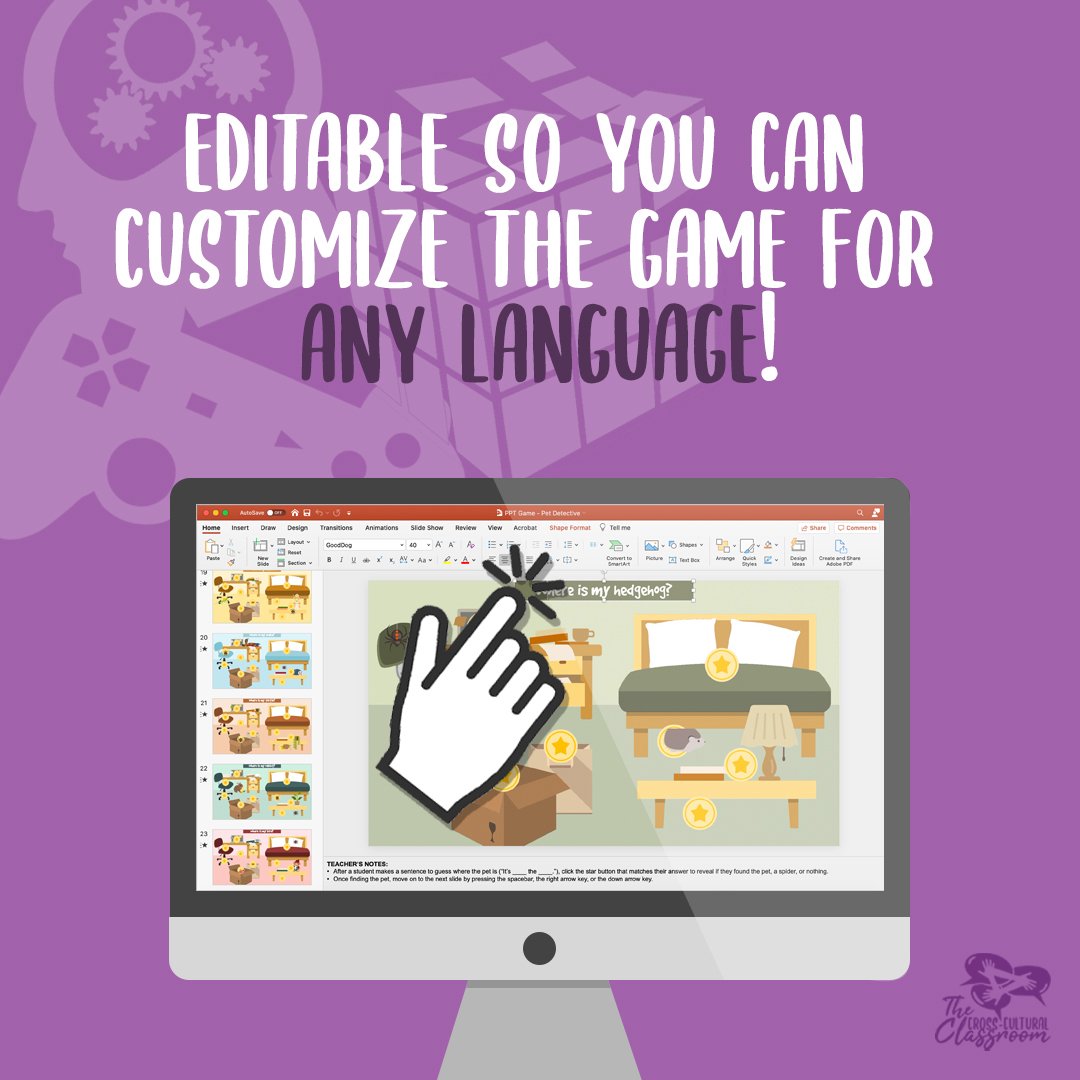 This game template has been created as a fun, animated PowerPoint and extra notes on how to play have been provided in the "Notes" sections of each slide. This game is also ready to play as is. However, if using it for a different language or you would to adjust the sentences for your class, all the text is editable. This Powerpoint has been tested on both Windows and Mac. If you have any questions, don't hesitate to reach out.