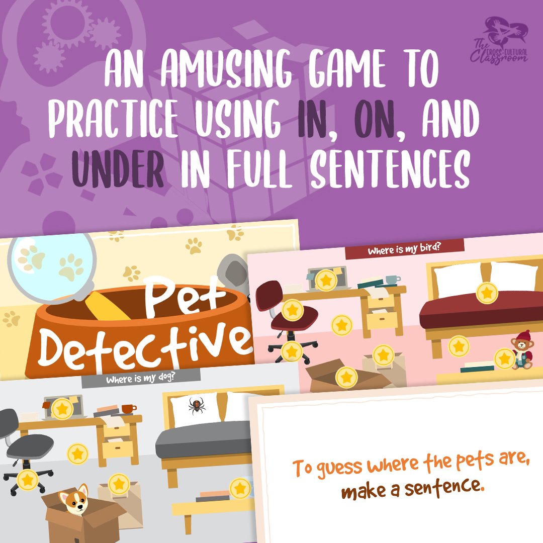 - To guess where a pet is, students make a sentence. For example, "It's under the bed." or "It's in the bag." or "It's on the chair."