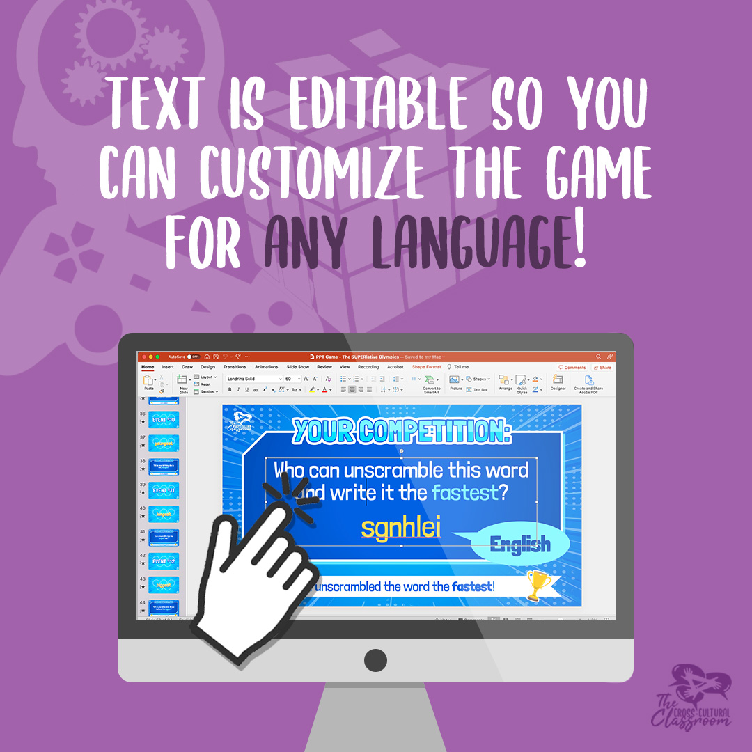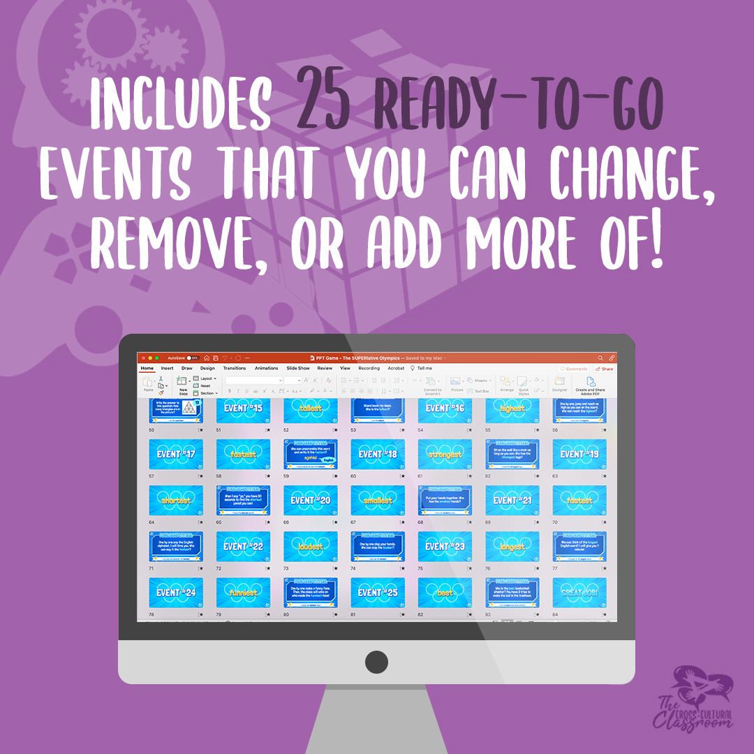 This game template has been created as a fun, animated PowerPoint. To make your job as easy as possible, you can play the game as is with my 25 pre-made game events or you can remove/add your own events using the template. Additionally, if using this game for a different language or you would like to adjust the sentences for your class, all the text is editable. If you have any questions, don't hesitate to reach out.