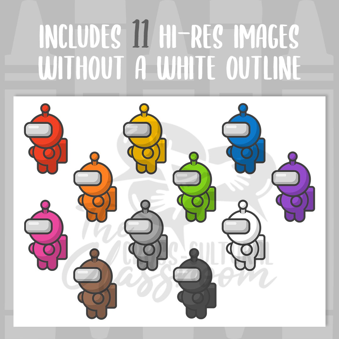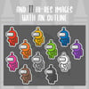 A set of Among Us-inspired spacemen clip art which contains a total of 22 files (11 images with a white outline and 11 images without a white outline). All images are hi-res, 300dpi, and PNG format with transparent backgrounds.