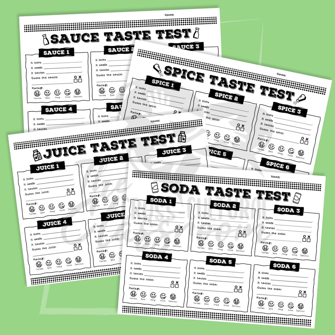 These are great worksheets to accompany a taste test activity or a class relating to the 5 senses. This bundle includes worksheets for a food taste test, a drink taste test, a snack test, a chip taste test, a cookie test test, a candy taste test, a soda taste test, a juice taste test, a sauce taste test, and a spice taste test.