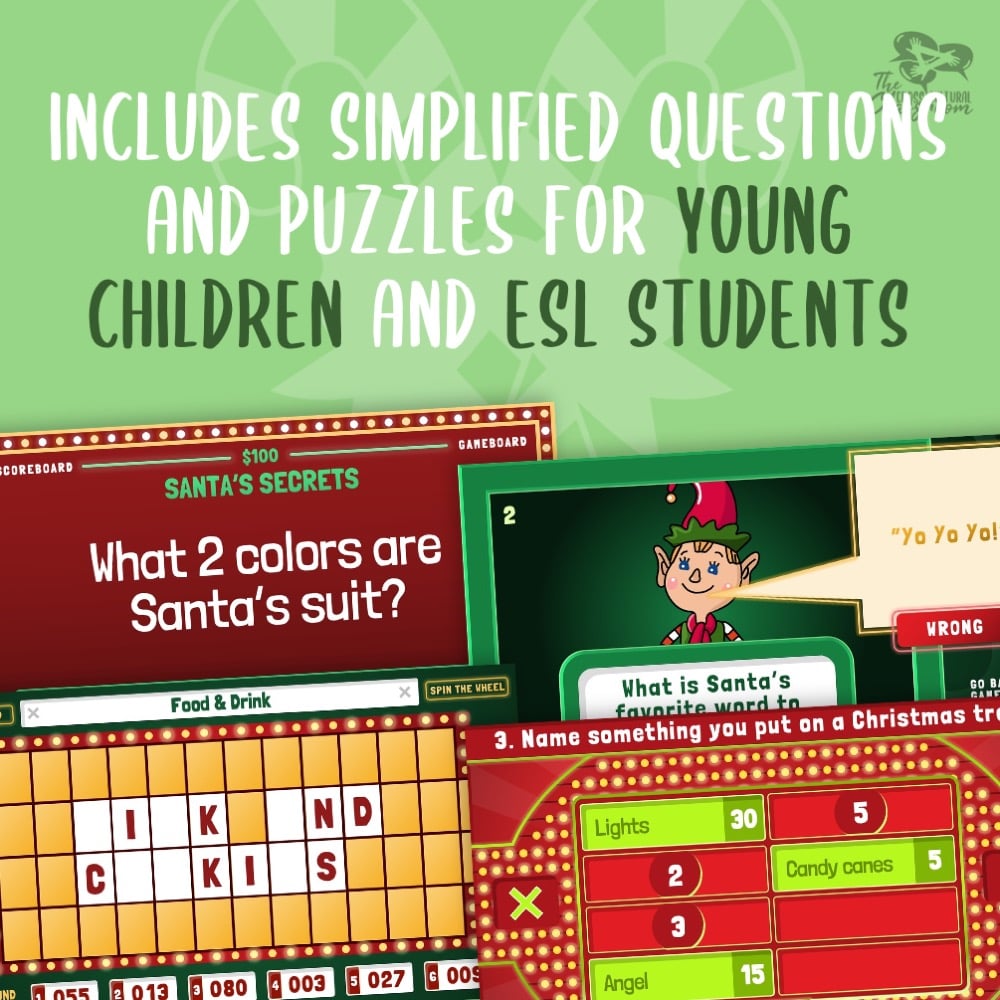 Ready-to-play Christmas editions of Jeopardy, Class Feud, Classroom Squares, and Wheel of Fortune made for kids of all ages! They're perfect for fun and festive classroom activities leading up to Christmas as well as great for practicing English skills or general knowledge of the holiday.
