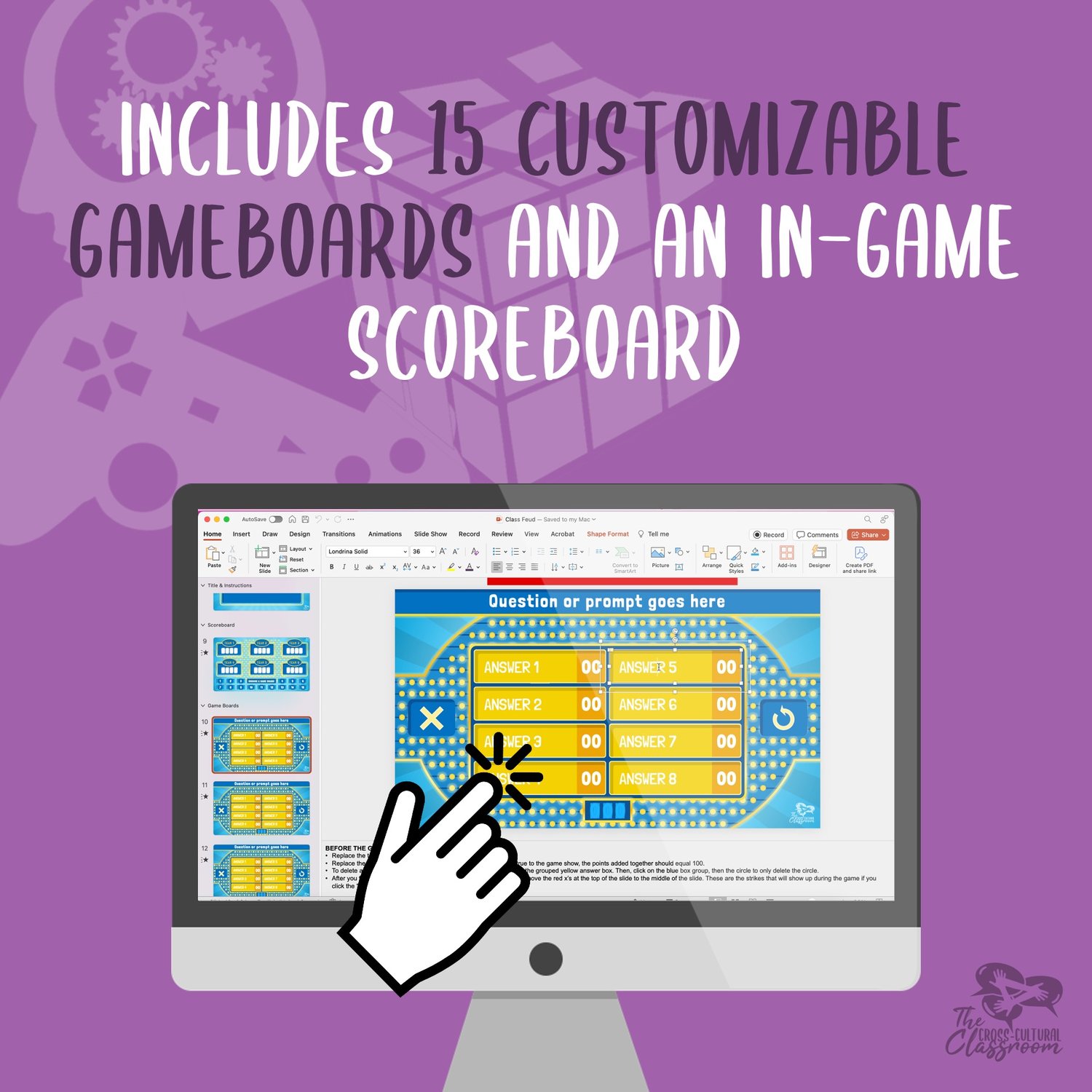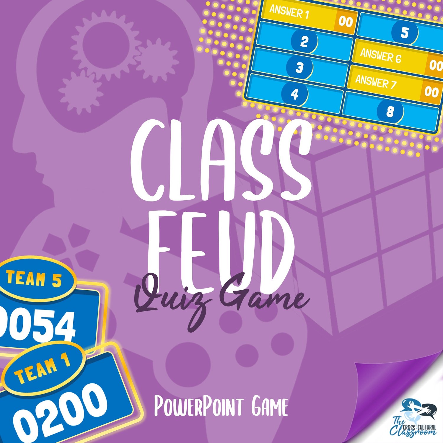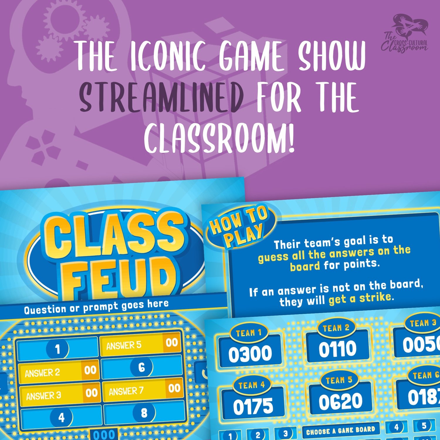 Based on the the popular game show, Family Feud, but with a new design and streamlined for classroom use! All you have to do is add your own questions/prompts and answers and the game is ready to play!