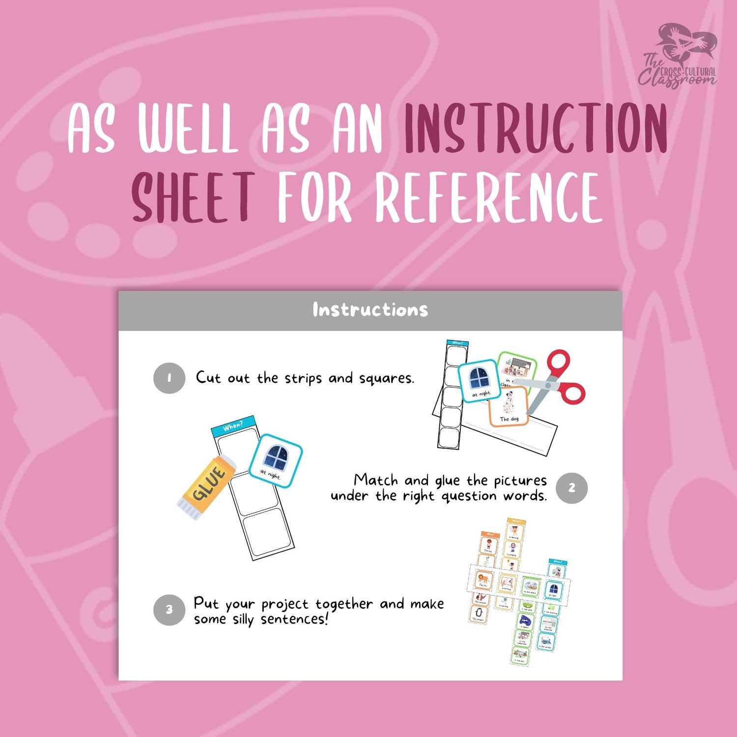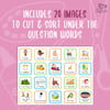 - First, students cut out the question word strips, strip holder template, and image squares.