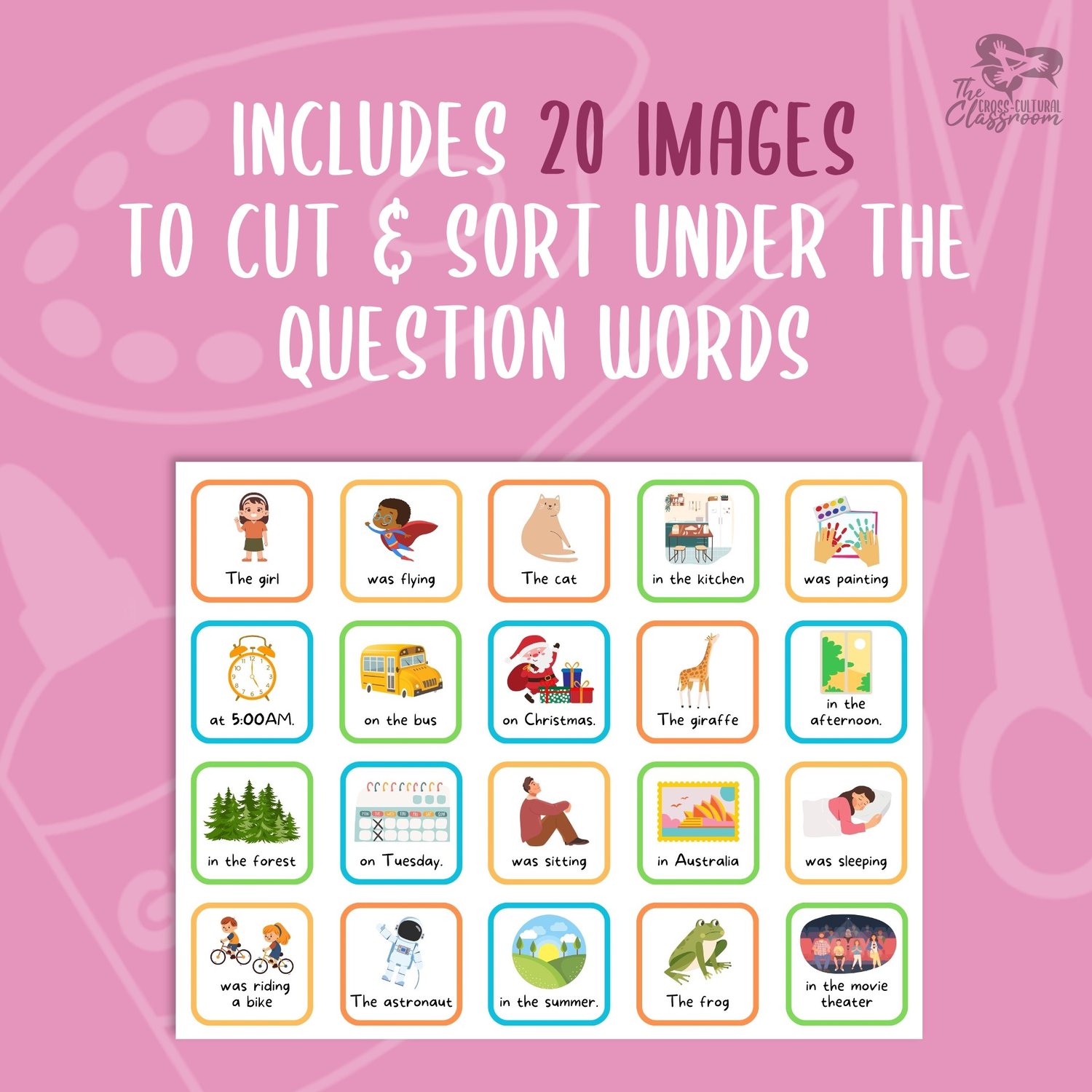 - Then, they will sort and glue the image squares under the correct question words of who, what, where, and when.