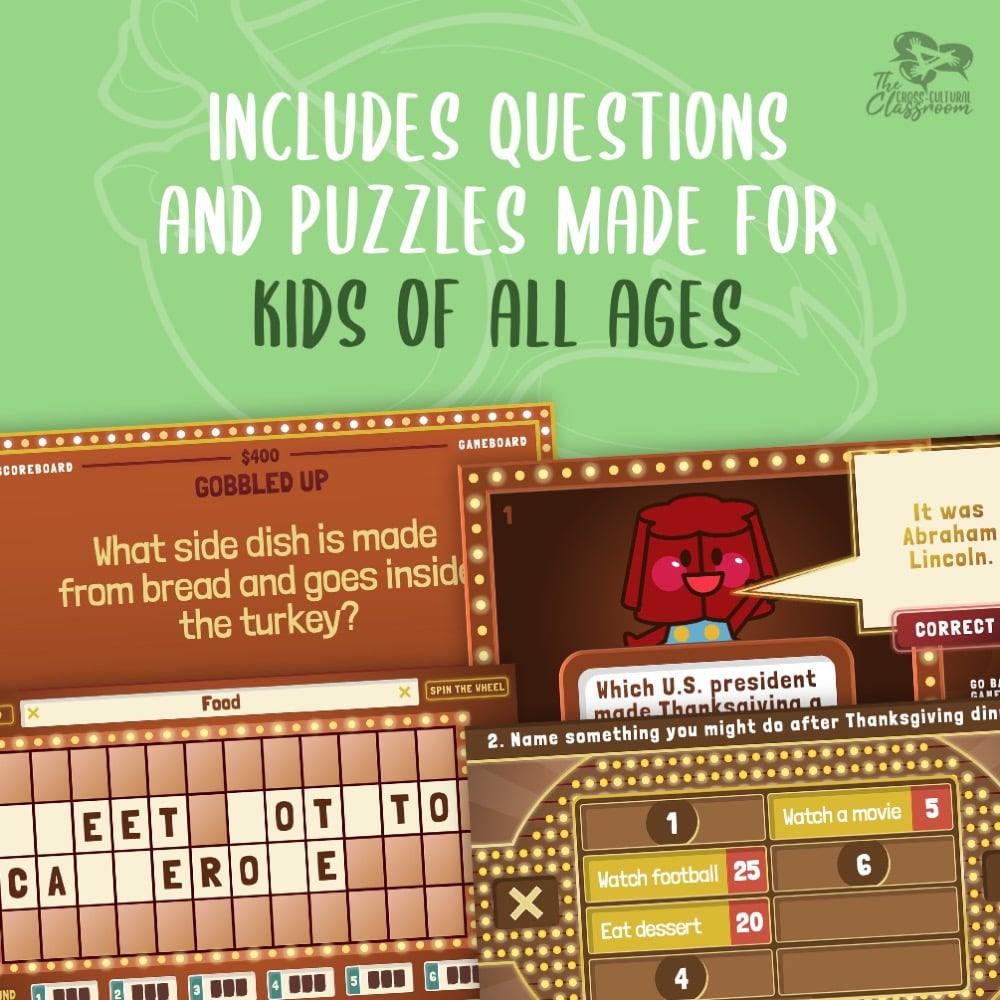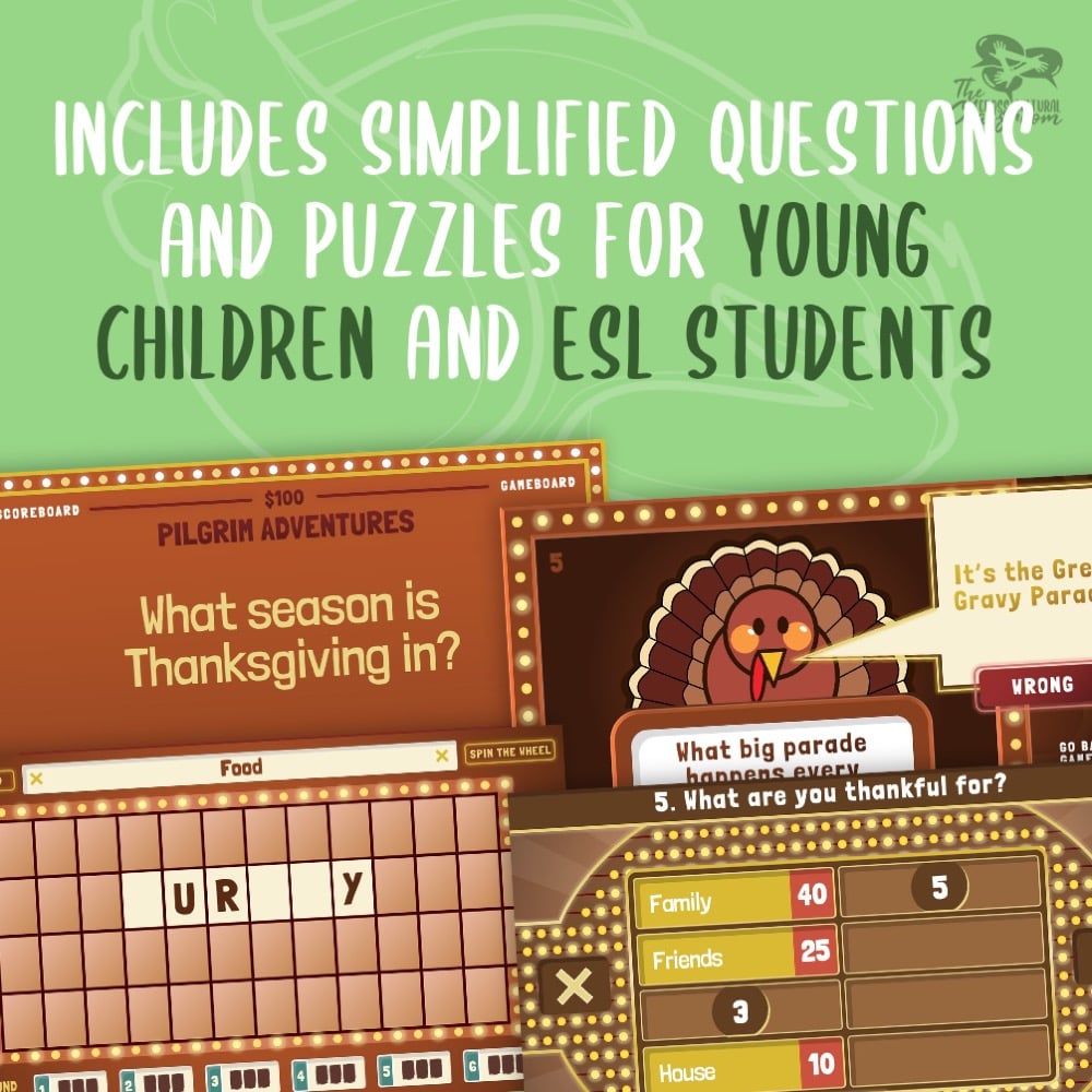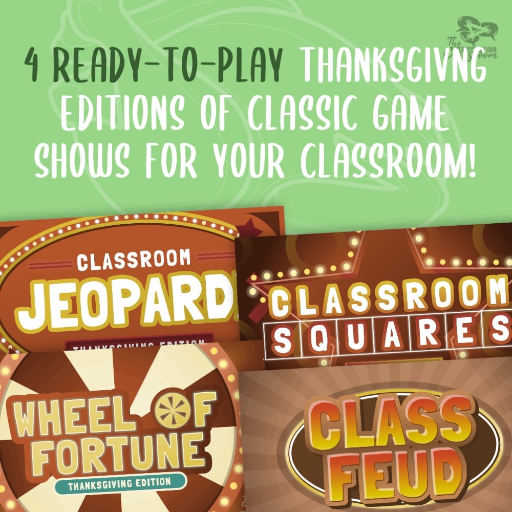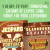 Ready-to-play Thanksgiving editions of Jeopardy, Class Feud, Classroom Squares, and Wheel of Fortune made for kids of all ages! They're perfect for festive and engaging classroom activities leading up to Thanksgiving as well as great for practicing English skills or general knowledge of the holiday.