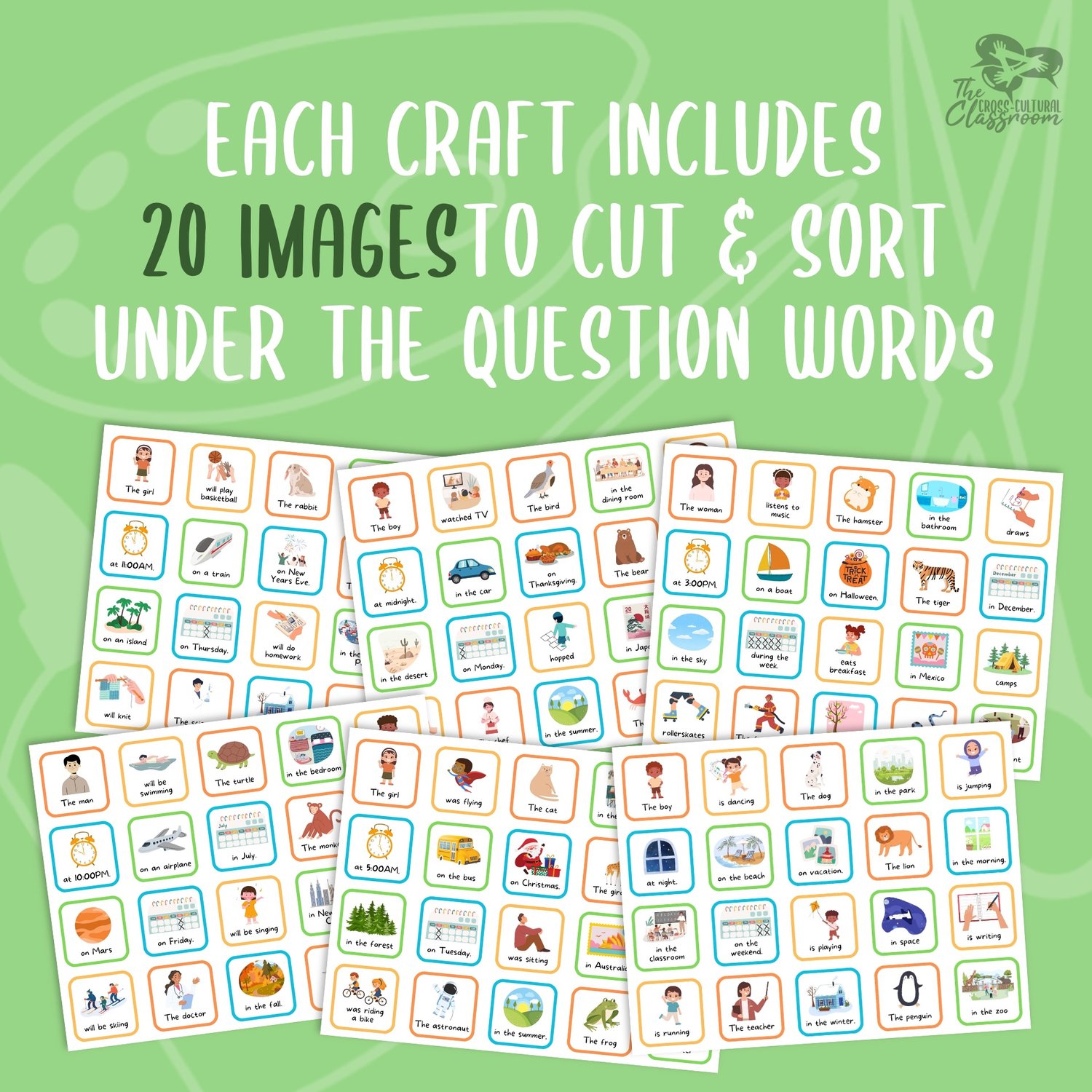 - First, students cut out the question word strips, strip holder template, and image squares.