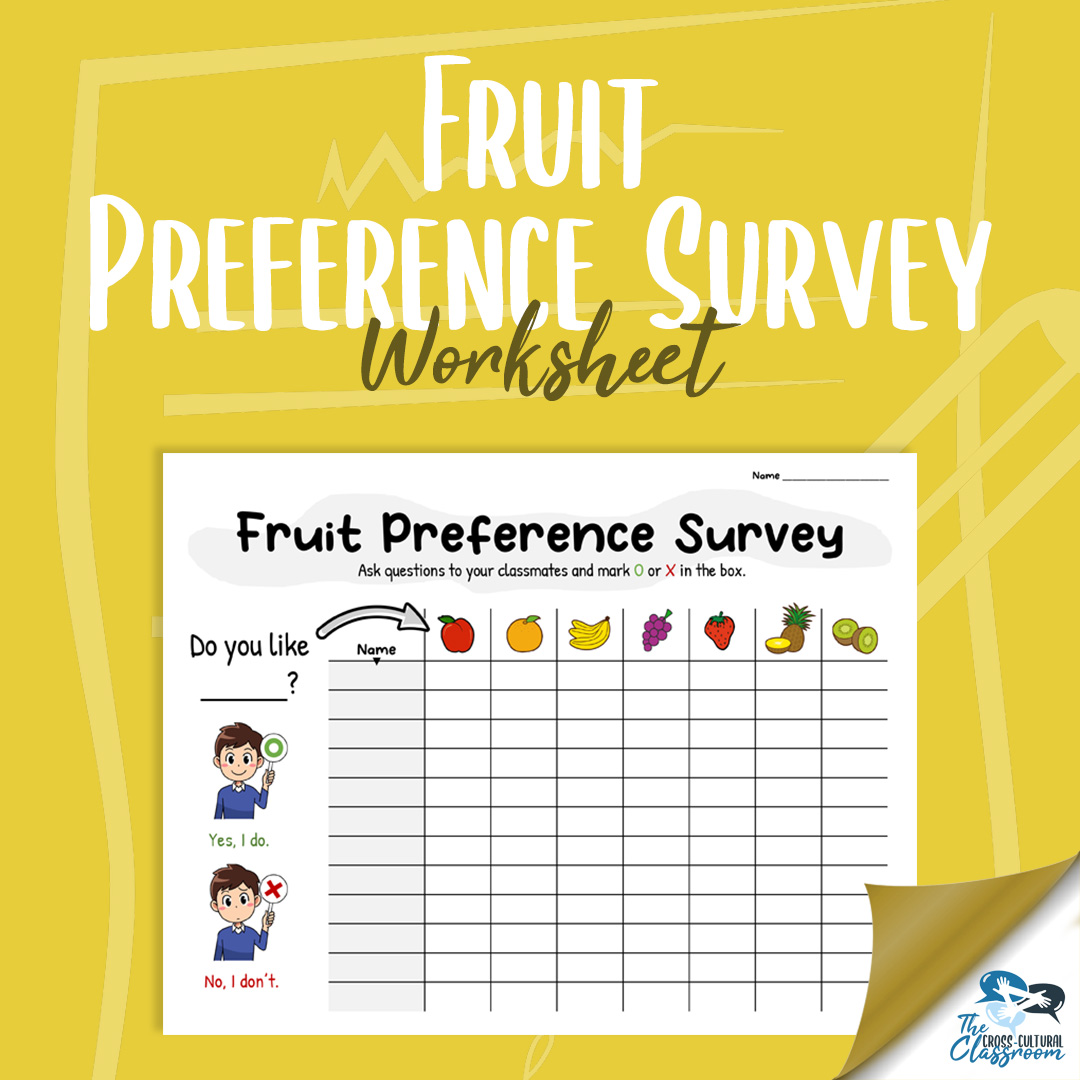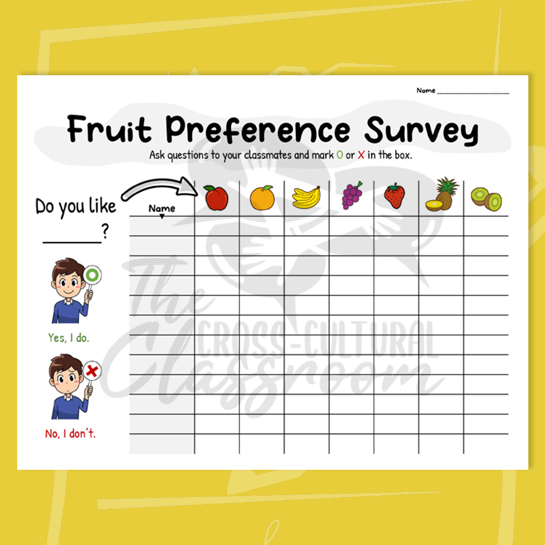 For this activity, students go around the room and ask each other yes and no questions about what fruits they like using the target language below. They then will record the answers they receive on their worksheet.
