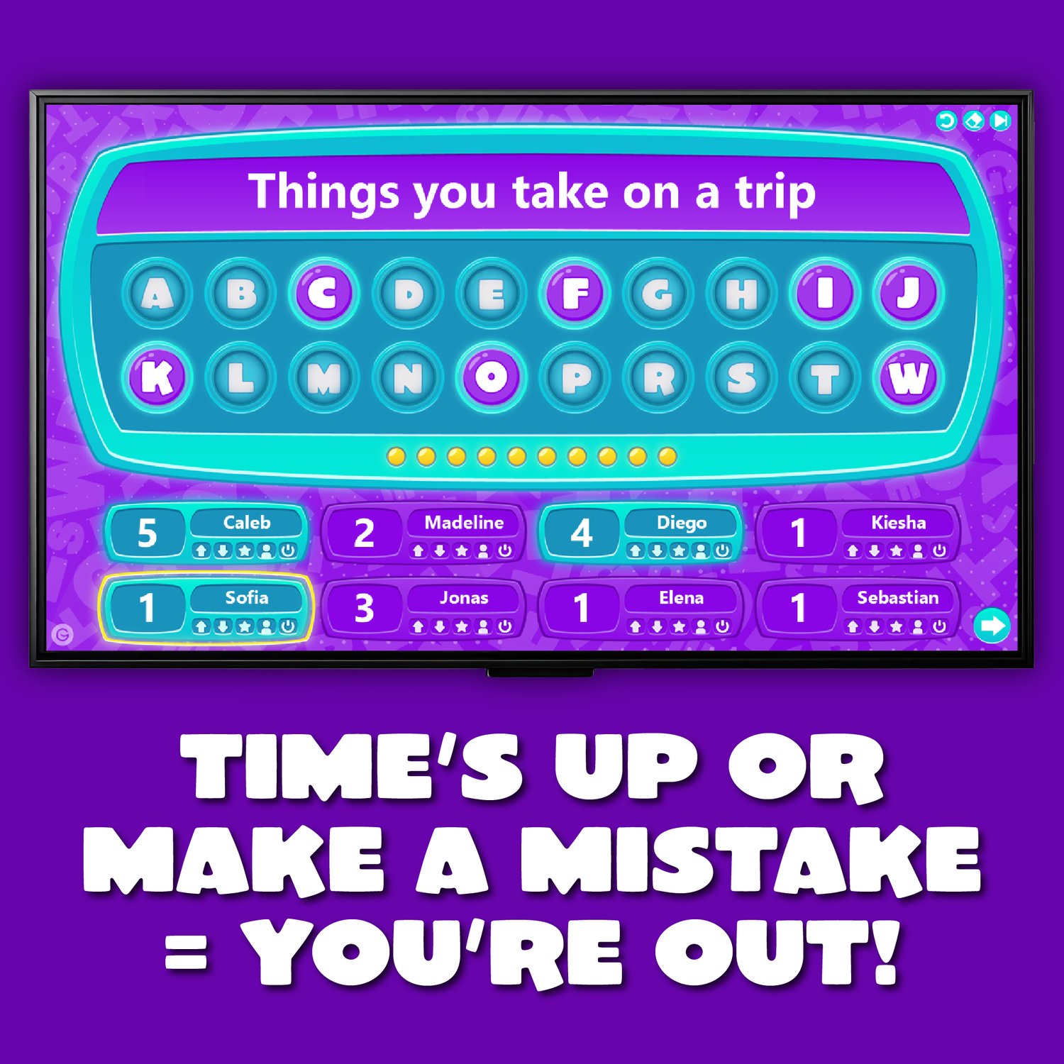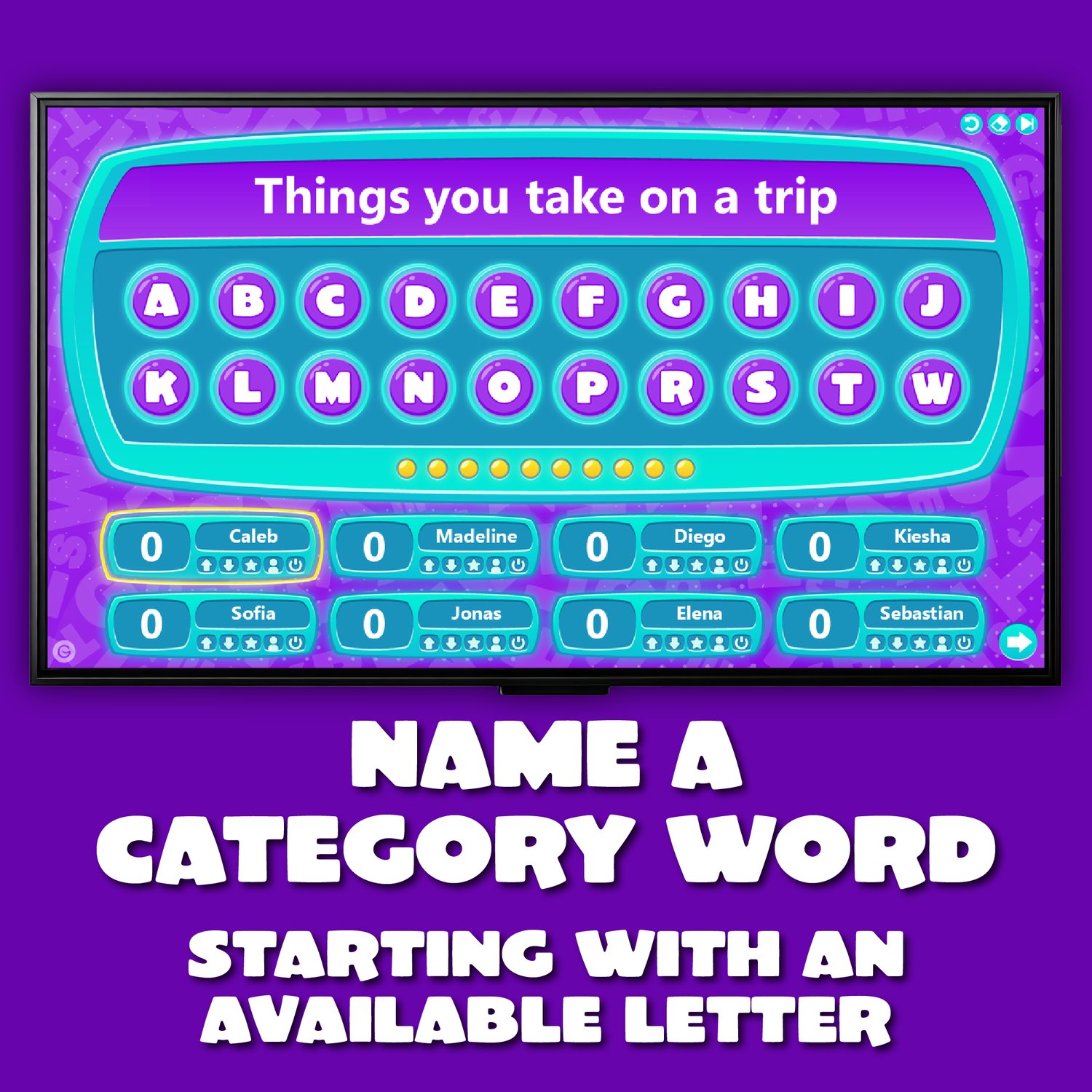 - Players have 10 seconds to name a word that fits the category starting with an available letter.