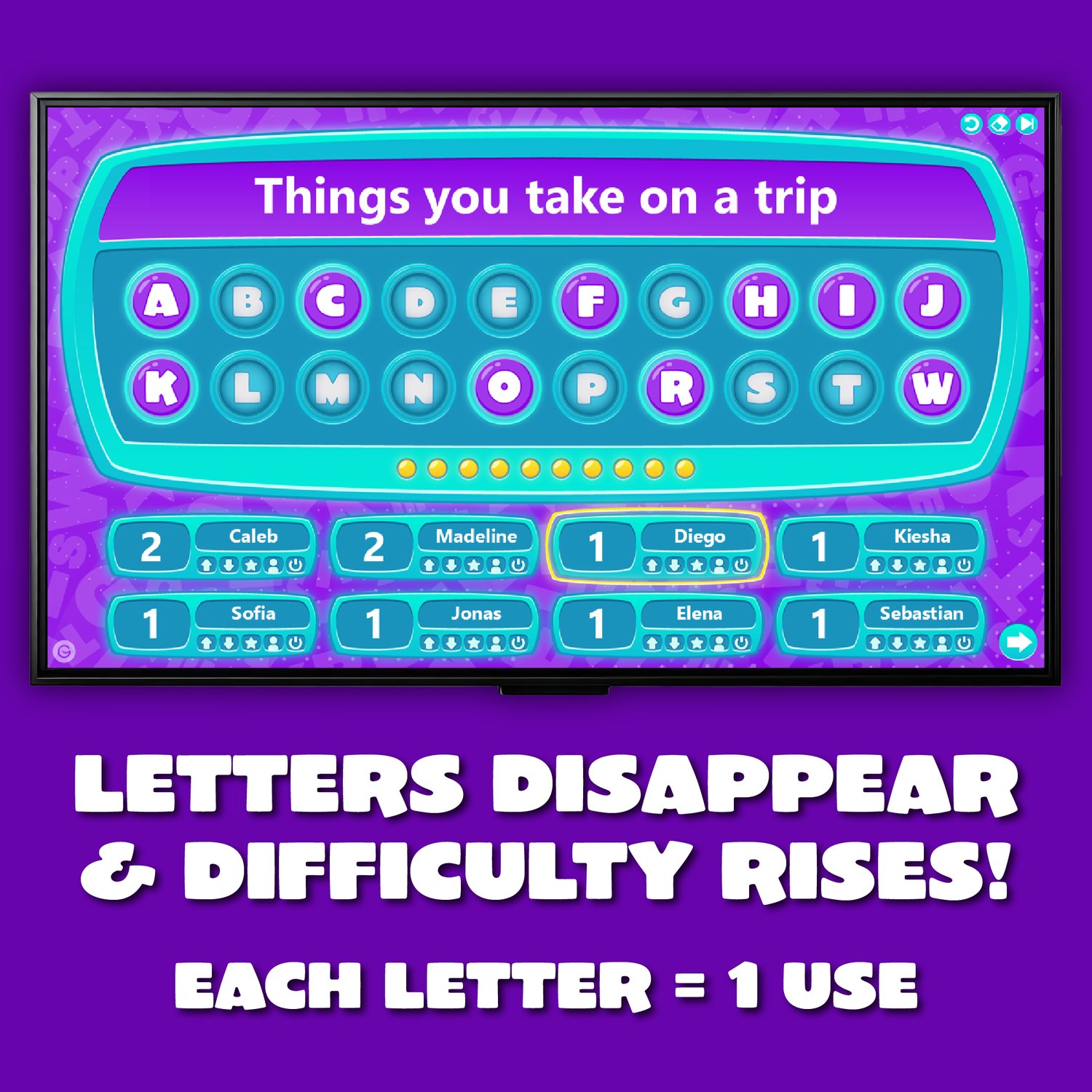Think fast, the letters don't last! AlphaBlitz is a fast-paced, interactive PowerPoint category word game where students race to name a word starting with an available letter before the timer runs out. Each letter can only be used once, adding a fun layer of strategy, quick thinking, and vocabulary recall that is perfect for classrooms, ESL vocabulary games and warm-up activities.
