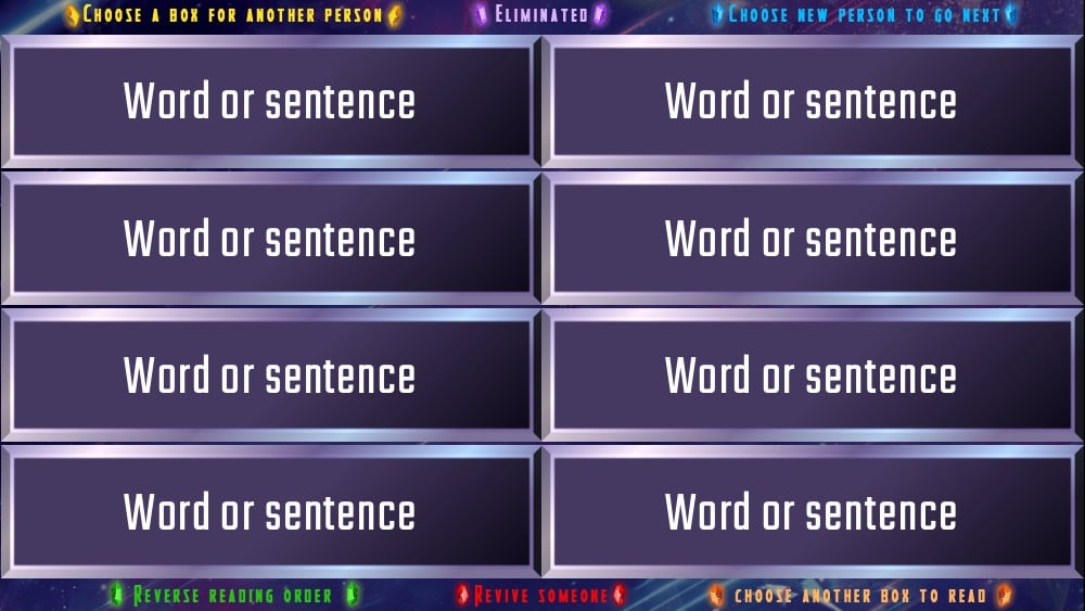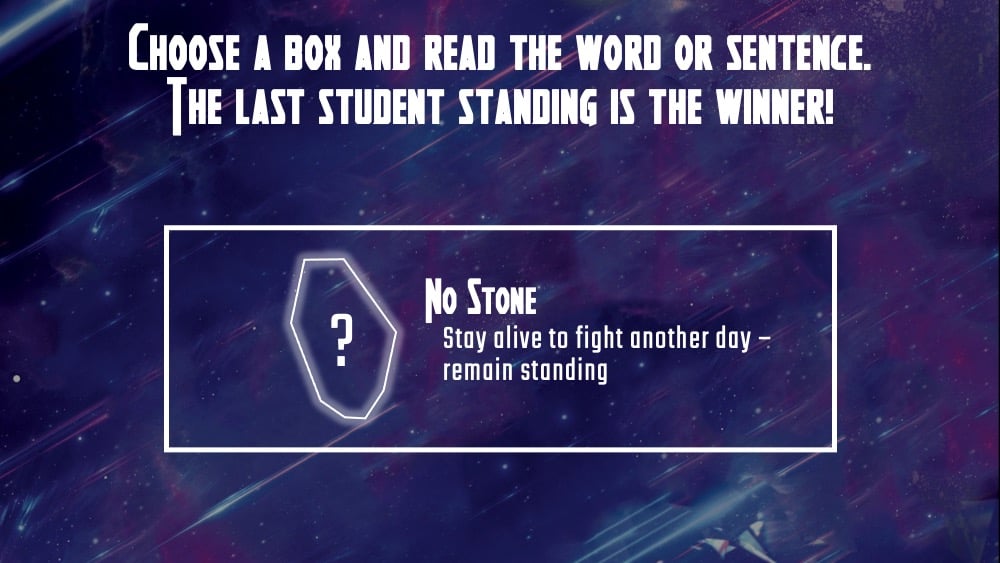 - If playing the game more than once with the same students, merely reorder the game slides to make it feel like a fresh game