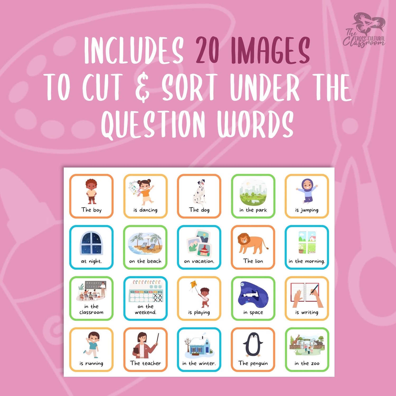- Then, they will sort and glue the image squares under the correct question words of who, what, where, and when.