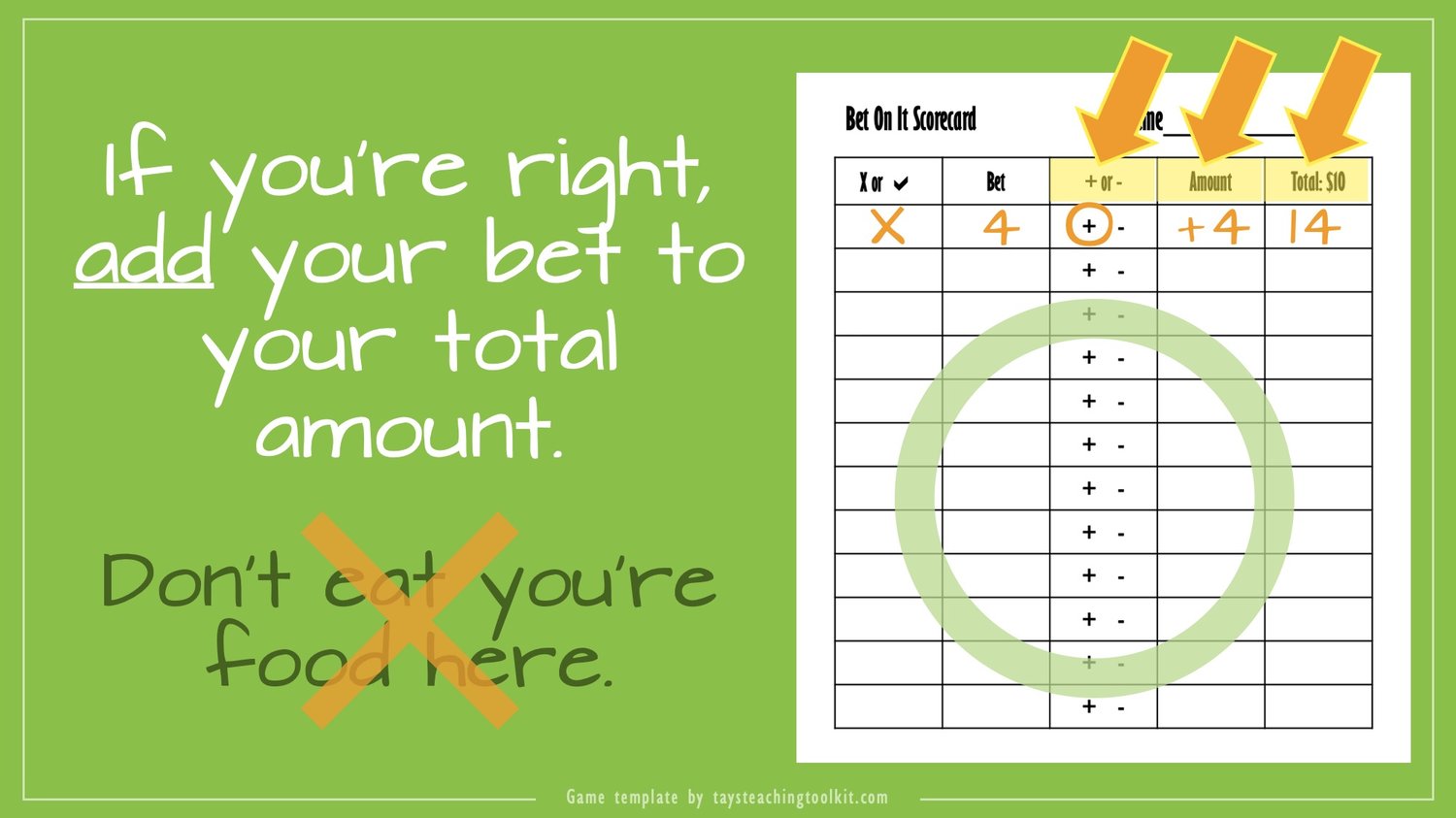 - Feel free to change the amount students can bet. When I used this game, I taught an elementary-level ESL class, so it was easier for me to explain in English that they could bet up to $10 versus their maximum bet is their current total amount for each round.