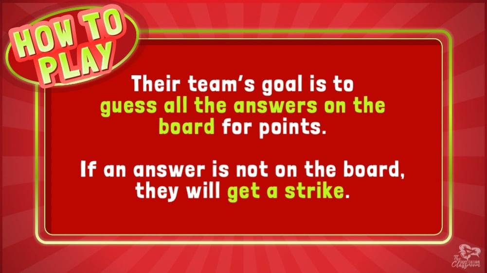 - If their team gets three strikes, the other team gets to try to answer. However, they only get one chance to guess an answer.