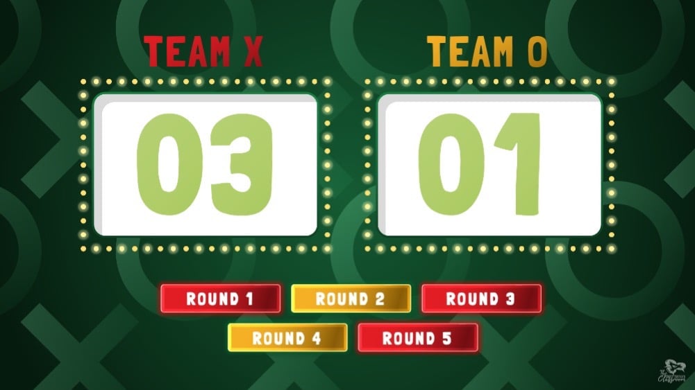- To win the round, one team either gets three in a row (across, vertical or diagonal) or has 5 squares.