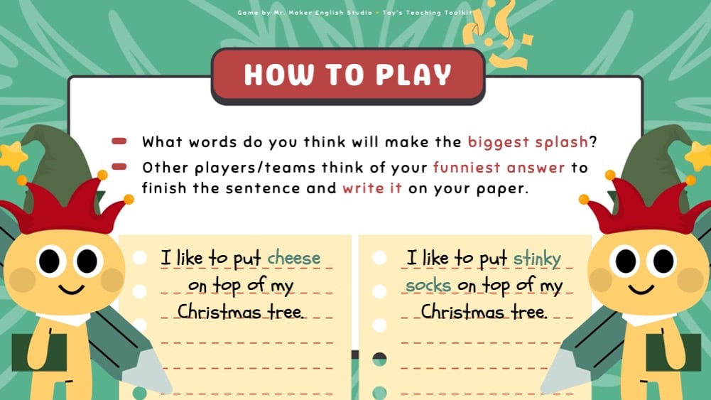 A festive, laugh-out-loud fill-in-the-blank game where students create hilarious Christmas sentences and vote for their favorites!