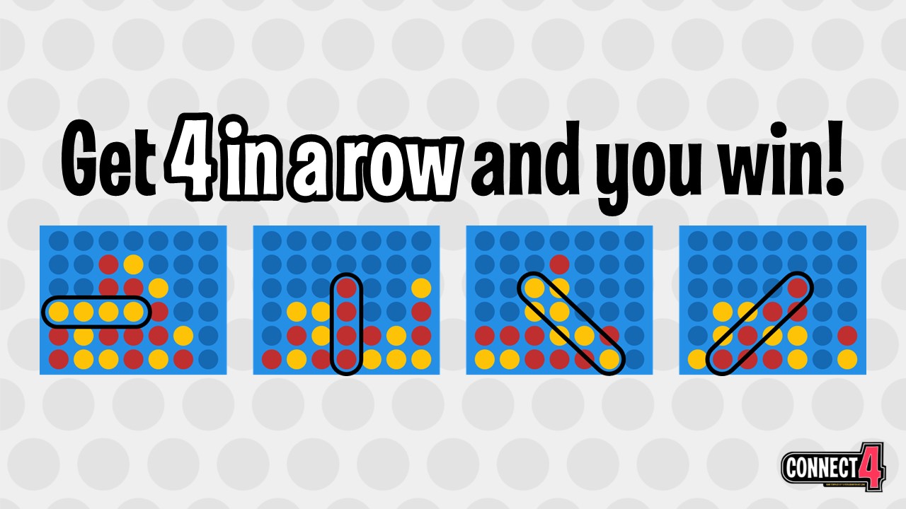 - Teams keep taking turns until one team gets four pucks of the same color in a row horizontally, vertically, or diagonally. That team wins the game.