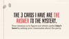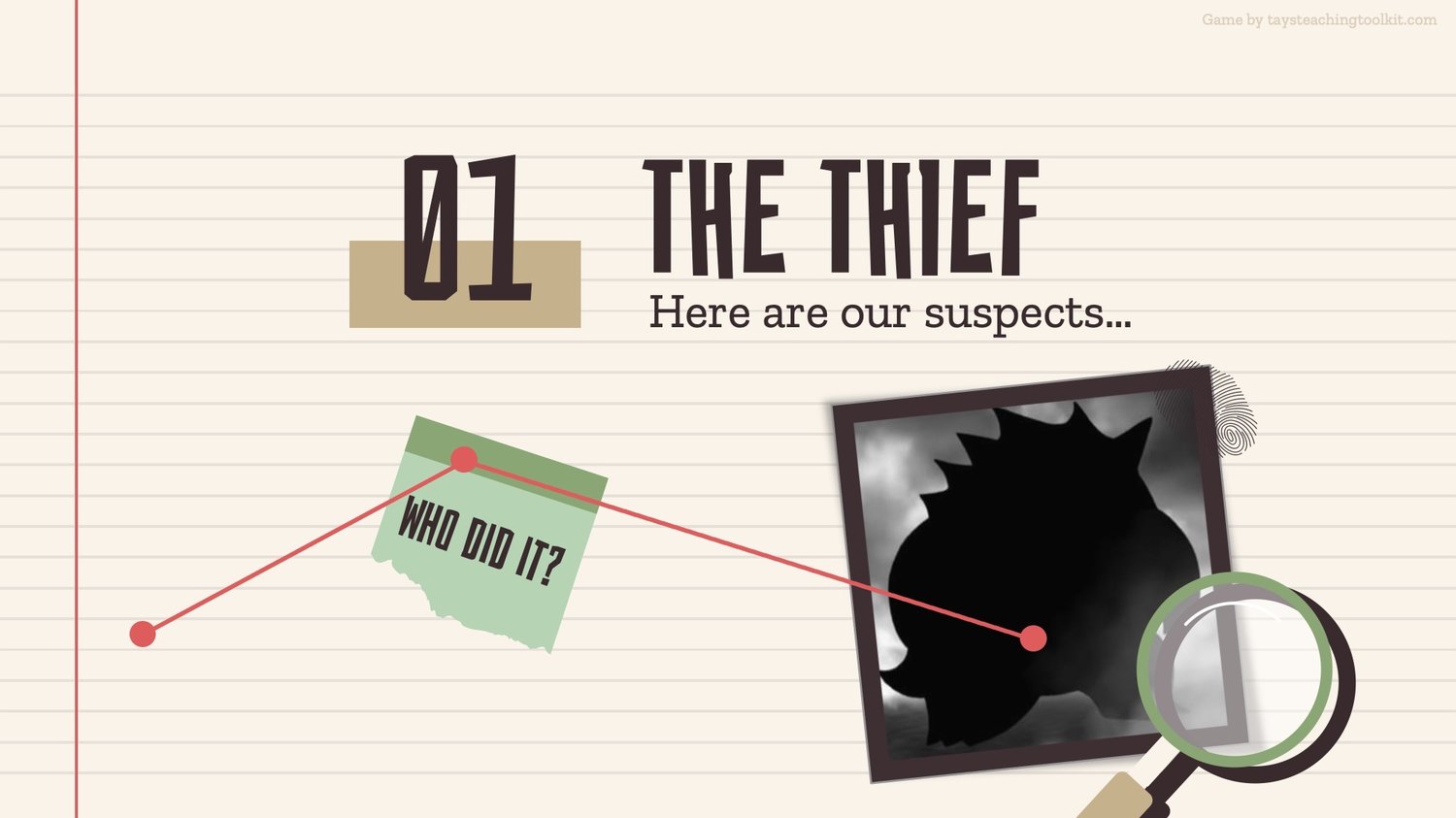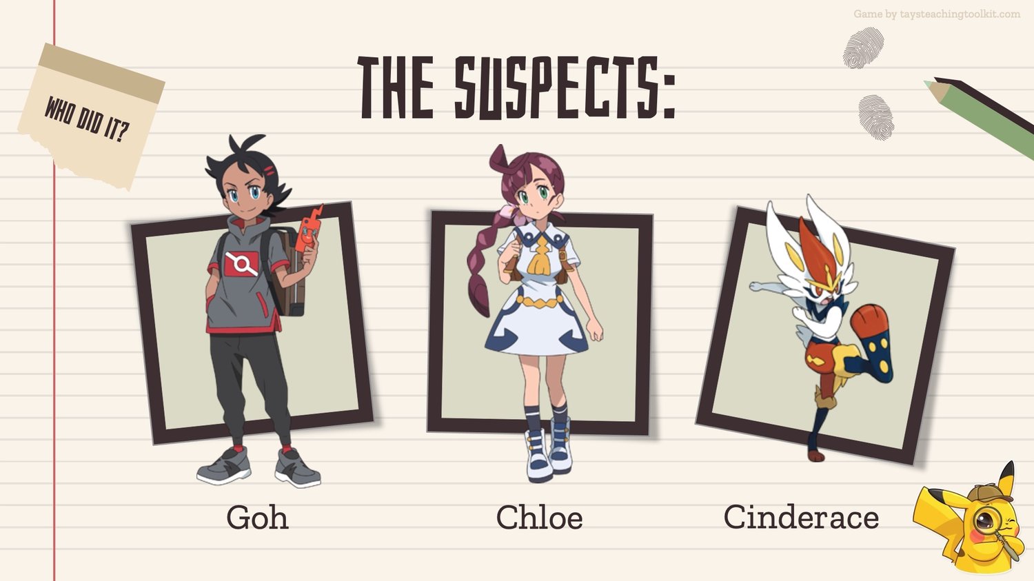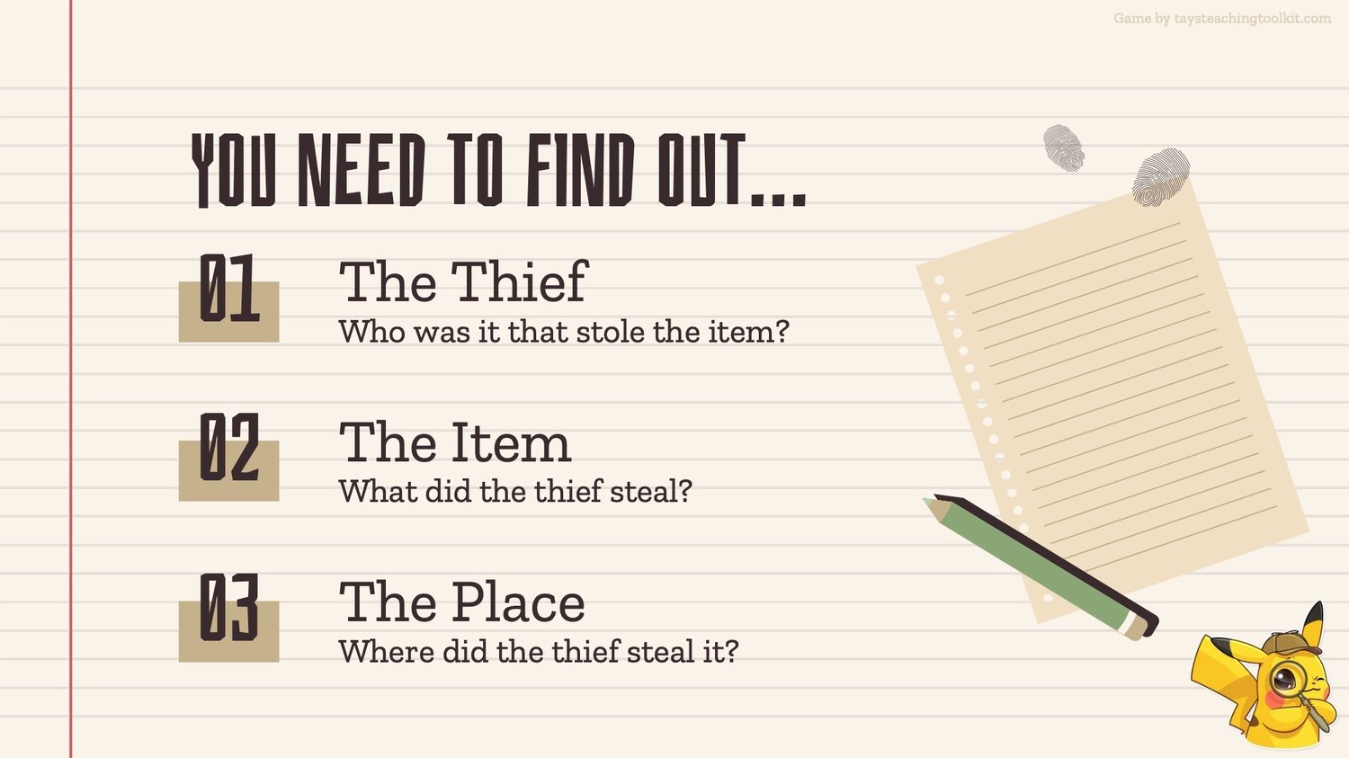 - Before playing the game, the teacher secretly chooses one of each type of card and puts them in their pocket or somewhere else hidden. These cards are the answer to the mystery.