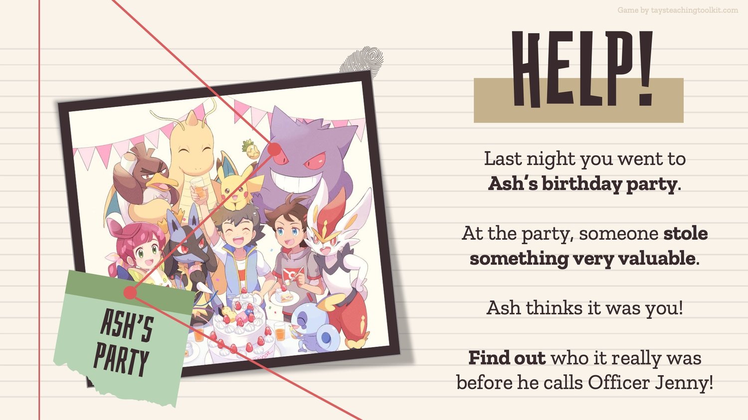 - An item from Ash’s house was stolen during his birthday party and students need to figure out what it was, who stole it, and where it was stolen from!