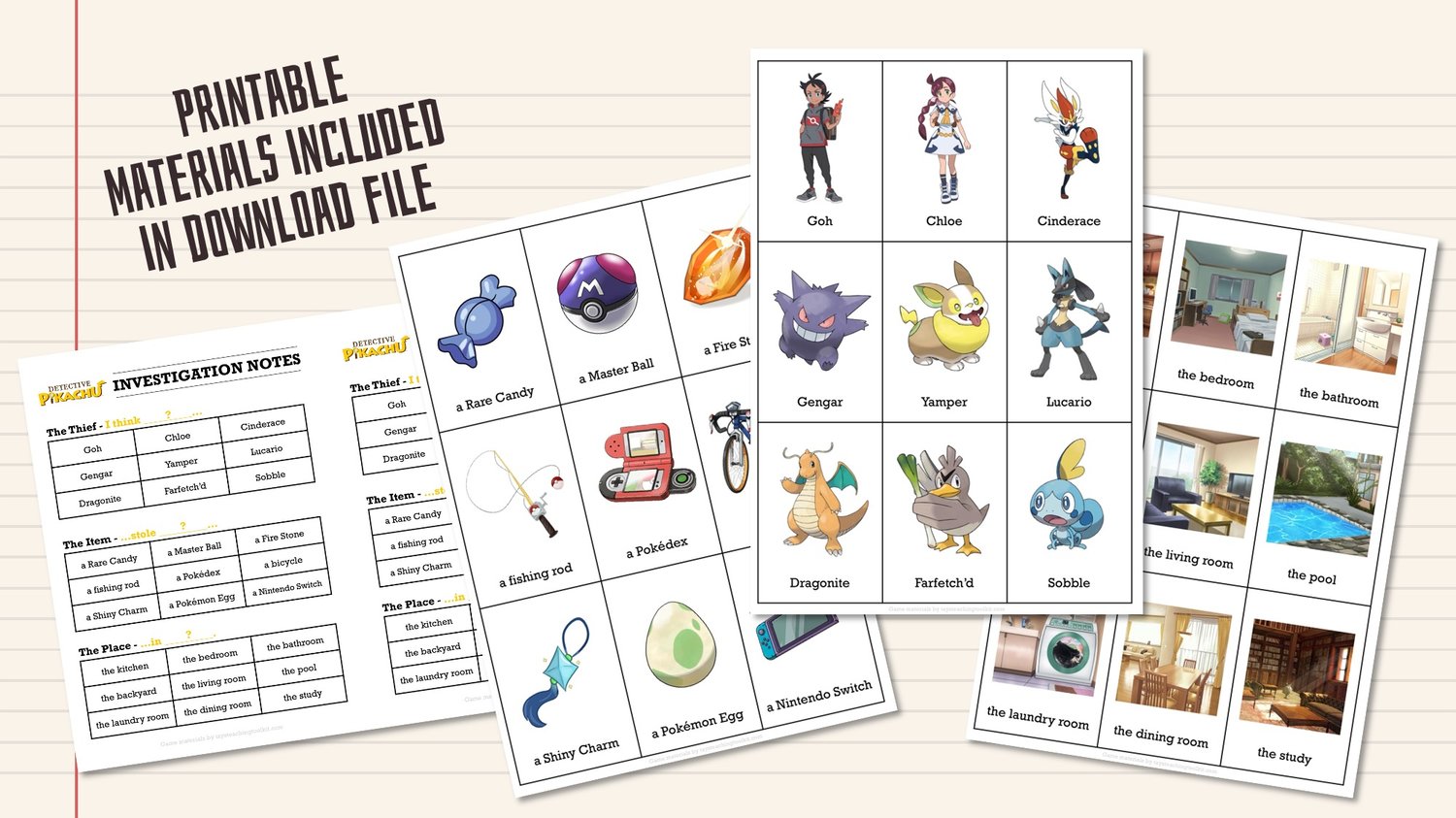 - For this game, there are nine suspect cards, nine item cards, nine place cards, and an Investigation Notes worksheet.