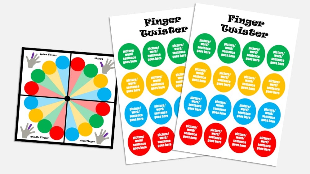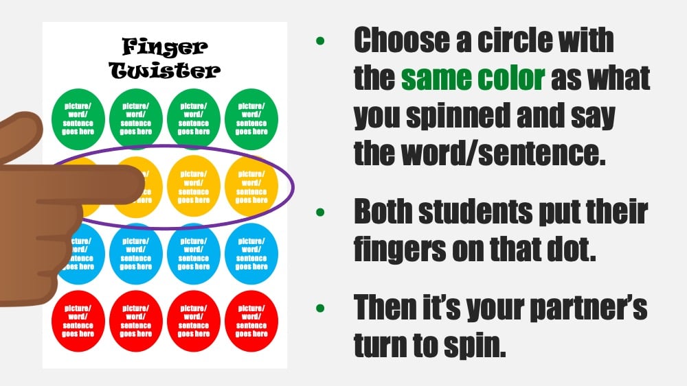 - The instructions above are for the reading version of this game. If you want to use it as a speaking activity, use images instead of text in the circles on the Twister sheets.