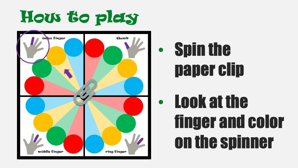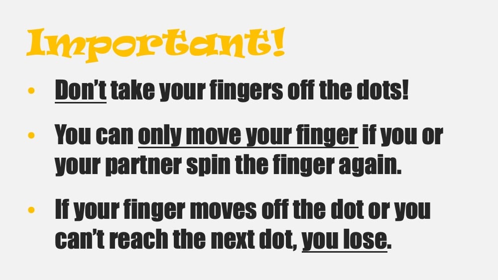 - Then, their partner spins and the game continues until a person's finger moves off a circle or they can’t reach the next circle.