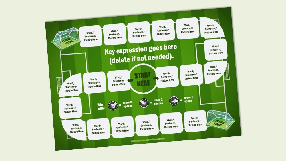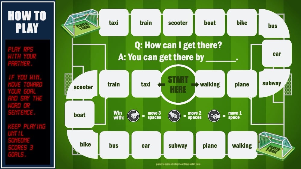 - The winner will move a certain number of spaces toward their goal depending on what they won with and say a word/sentence according to the box they landed on. Example: Player 1 wins with scissors, so they move the soccer ball 1 box to the right toward their goal. Then in the next round, Player 2 wins with rock. They then move the soccer ball 3 spaces to the left toward their goal.
