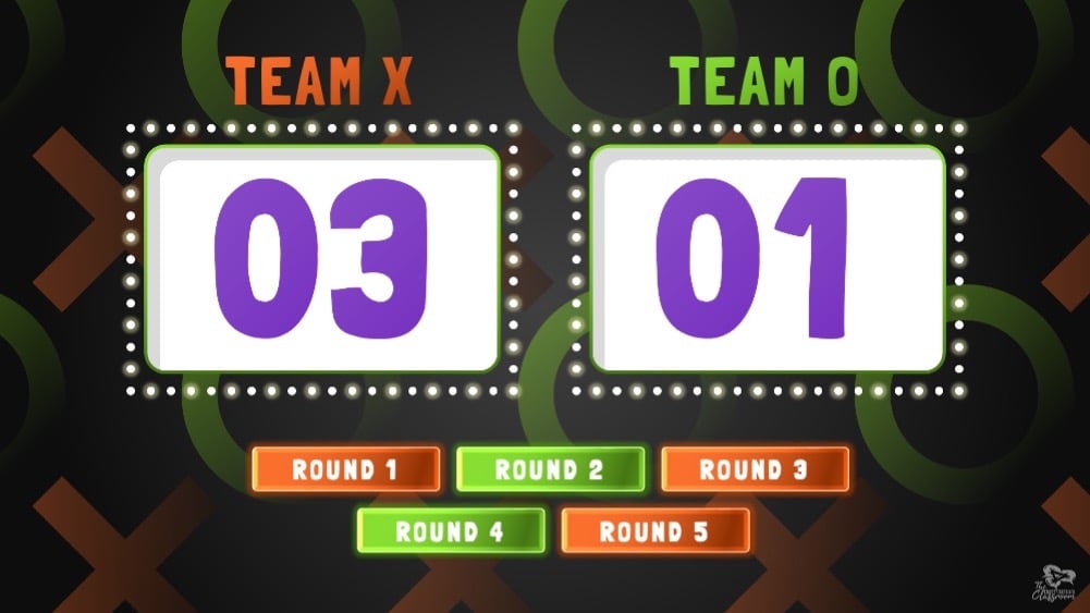 - To win the round, one team either gets three in a row (across, vertical or diagonal) or has 5 squares.
