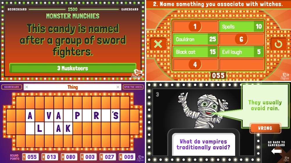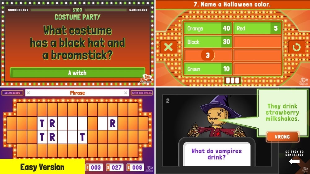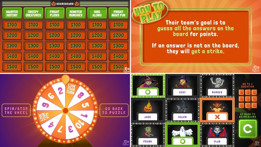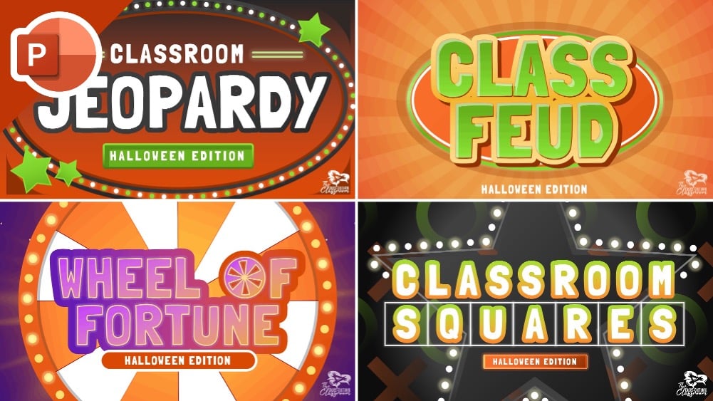Ready-to-play Halloween editions of Jeopardy, Class Feud, Classroom Squares, and Wheel of Fortune made for kids of all ages! They're perfect for spooky and fun classroom activities leading up to Halloween as well as great for practicing English skills or general knowledge of the holiday.
