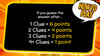 - The first student to say the correct answer gets points for their team. If 1 clue was given, their team gets 6 points, if 2 clues, 4 points, 3 clues, 2 points, and 4 or more clues, only 1 point.