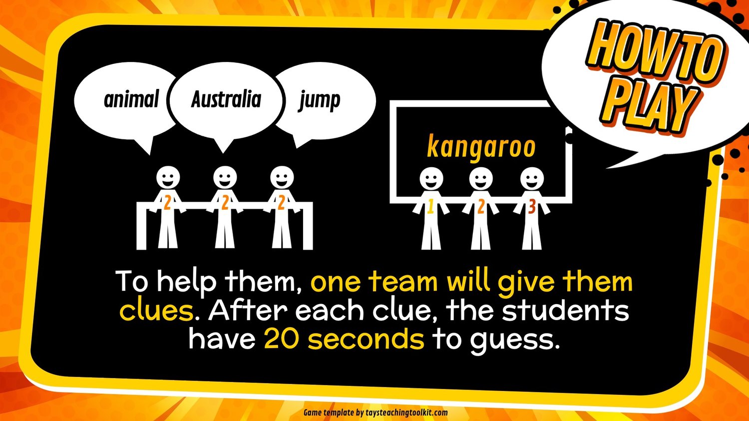 - The clues will be given to the students at the front one at a time. After a clue is given, you will start a 20 second timer allowing the students at the front to guess.