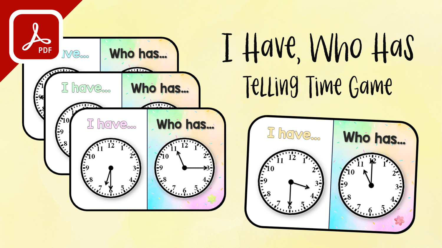 I Have, Who Has is a popular call-and-response game. In this game each student will get one (or two depending on your class and deck size) cards that they'll put face-up on their desk. The teacher should ask one student to start by asking “Who Has (time)?” on their card, out loud. The other students should listen and look at the “I Have” section of their card. If they have the matching time, they should answer with “I have (time).” Then ask for the time on the “Who Has” section of their card, “Who has (time)?” The game continues until it loops back to the first student answering with “I have (time).”