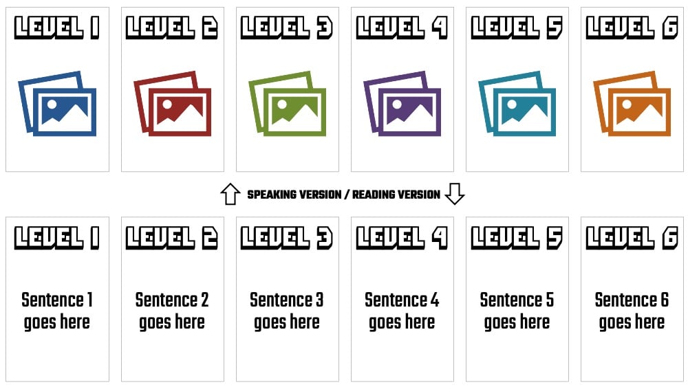 - Students play this game individually and each student gets a set of six cards, each with a different level and image.
