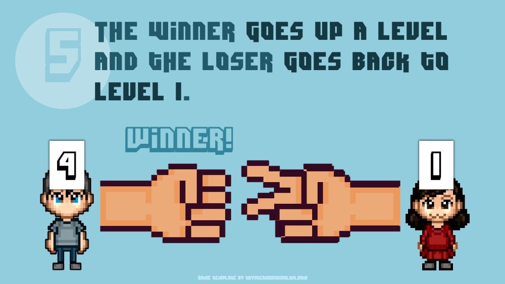 - The winner moves up a level and the loser has to go all the way back to level one. They signify this by holding up a new card to their forehead.