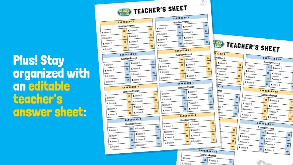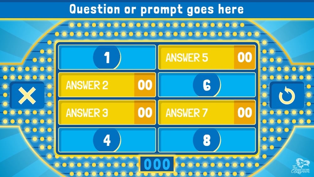 Based on the the popular game show, Family Feud, but with a new design and streamlined for classroom use! All you have to do is add your own questions/prompts and answers and the game is ready to play!