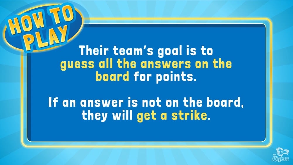- If their team gets three strikes, the other team gets to try to answer. However, they only get one chance to guess an answer.