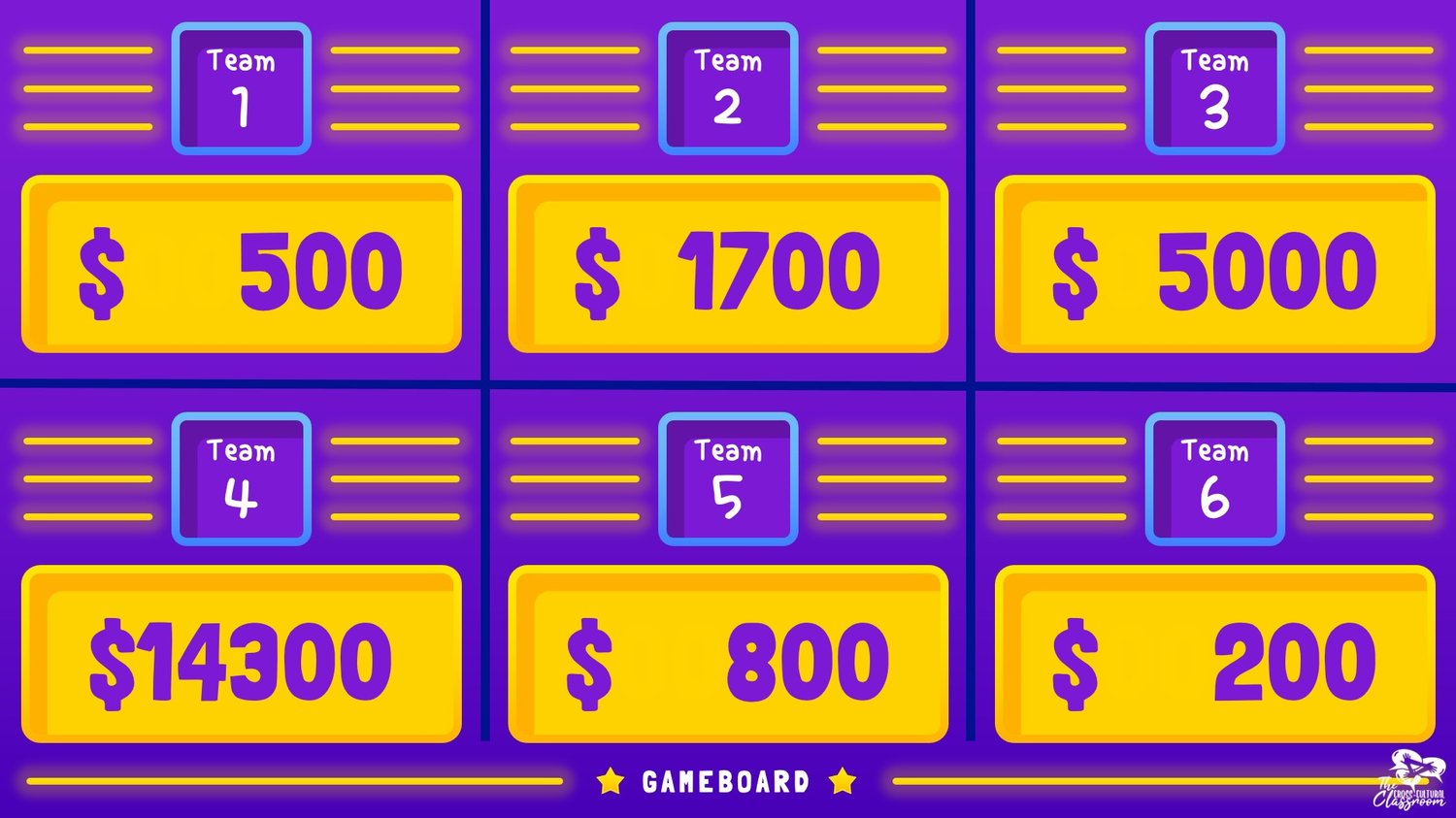- The individual/pair/team that answers correctly the fastest gets the money! (I have also played where any team who answers correctly gets the money or only the team who chooses the question gets to answer for the chance at winning the money. How you play is up to you and what works best for your class.)