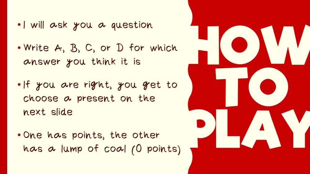 Get your students in the holiday spirit with this ready-to-play Christmas quiz! The questions may be easy, but things get a little more interesting when students have to choose their fate after answering correctly: Do they choose the blue or the yellow present? One contains a point value, the other a lump of coal.