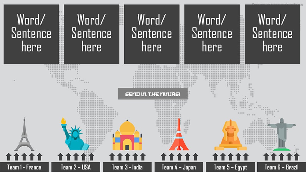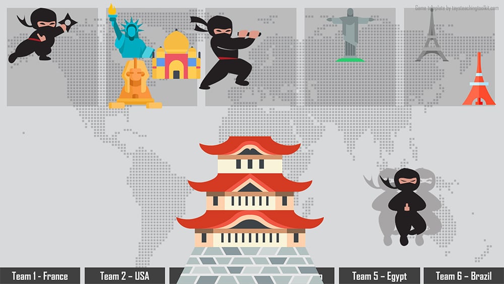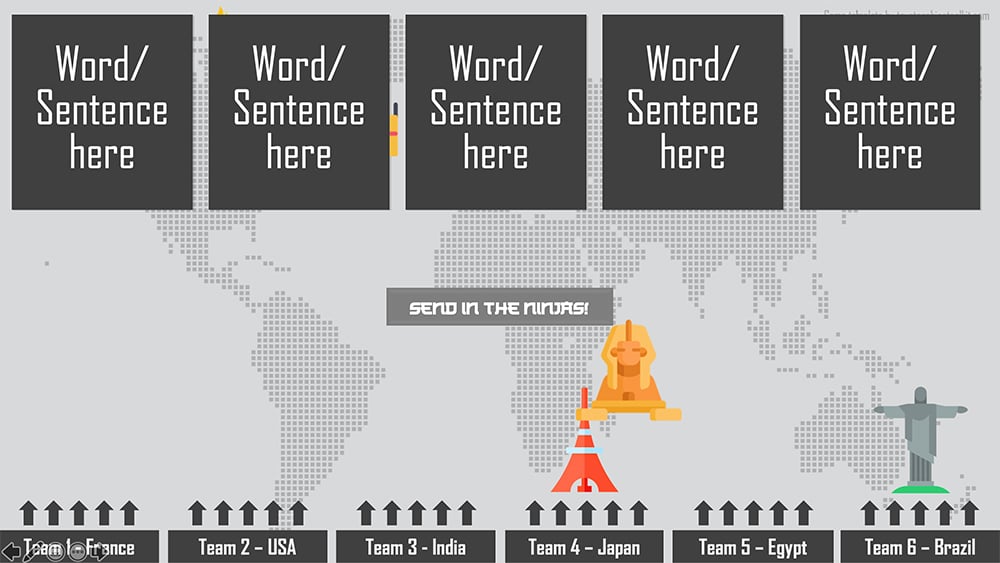- The online/Zoom version of this game is also the writing version. For this version, have students individually choose a box and write their answer, send in the ninjas, and students whose boxes aren't attacked win points!