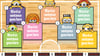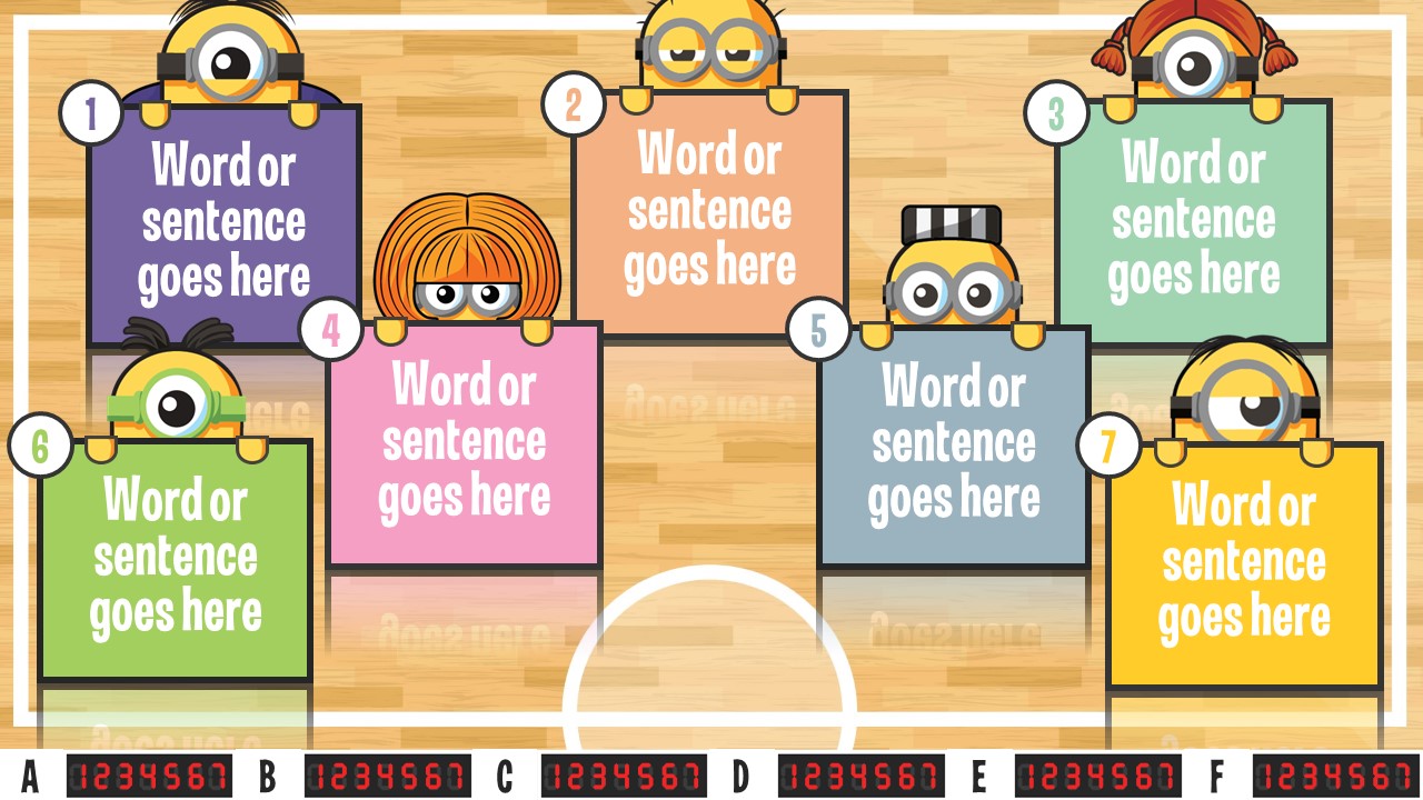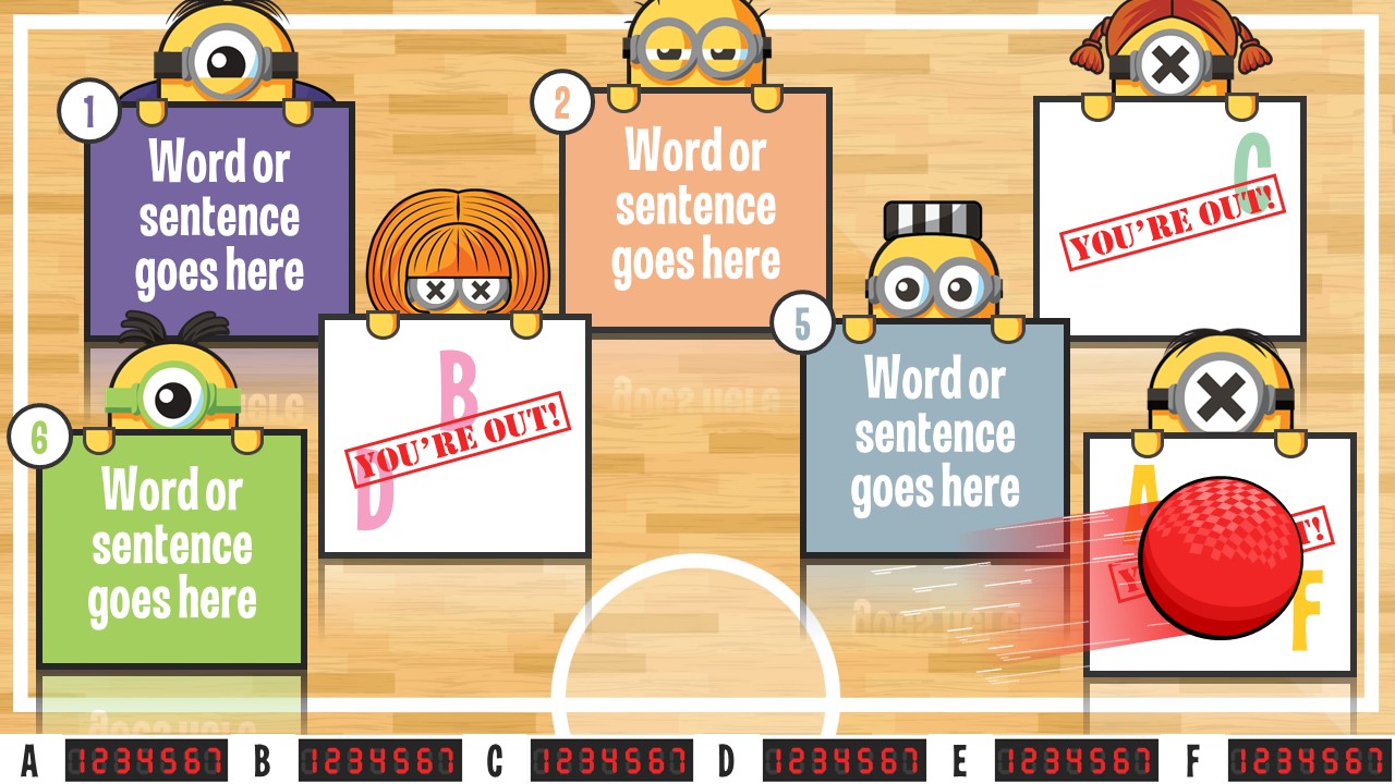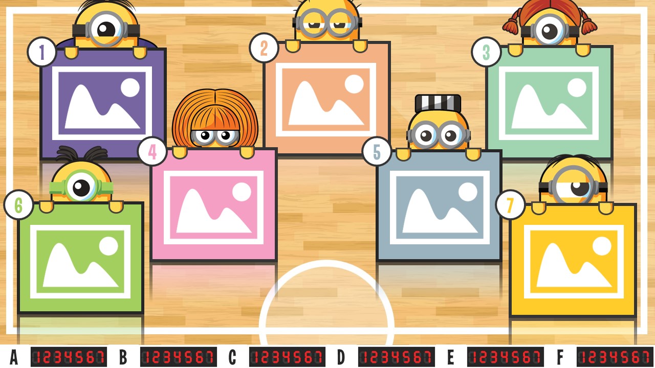 - During the game, first each team secretly chooses a Minion on the dodgeball court: 1, 2, 3, 4, 5, 6, or 7. The teacher clicks the number on the scoreboard at the bottom associated with the Minion each team chooses. This will hide the team’s letter behind the colored sign the Minion is holding.
