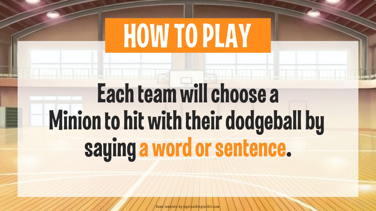 - Once all teams have chosen a Minion, then one by one, each team will choose a different Minion to hit their dodgeball with by saying the word/sentence on the sign the Minion is holding.