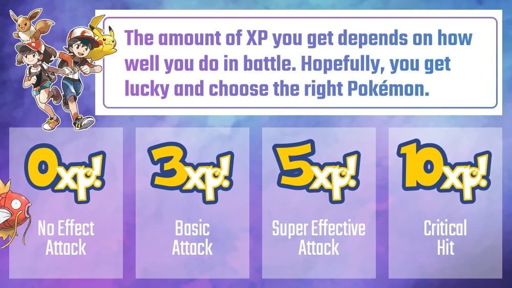 - How many XP they get depends on how effective the attack is. They also have the ability to change points with another team if they are lucky enough to send out a shiny Magikarp.