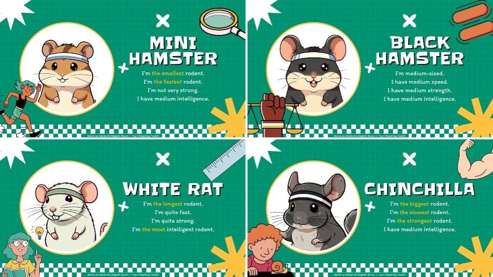 - Introduce the 4 competing rodents: A Mini Hamster, Black Hamster, Rat, and Chinchilla