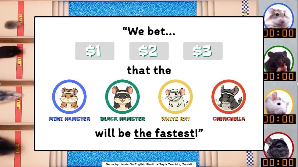 - Before each race, students place a bet of $1–$3 by making a sentence (ex. “I bet $2 the black hamster will be the fastest!”)