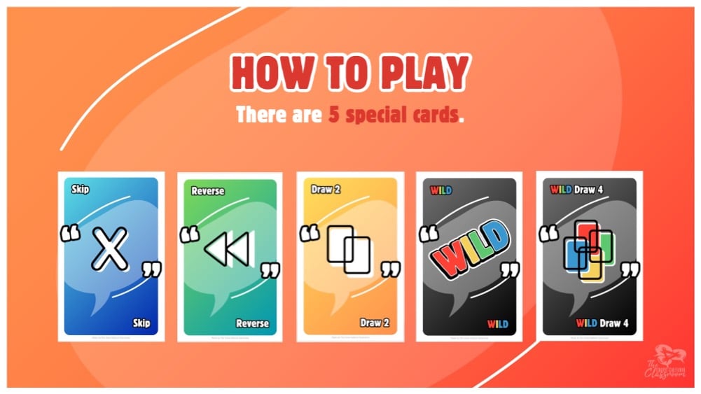 - There are also special cards to mix things up! (Skip, Reverse, Draw 2, Wild, etc.)