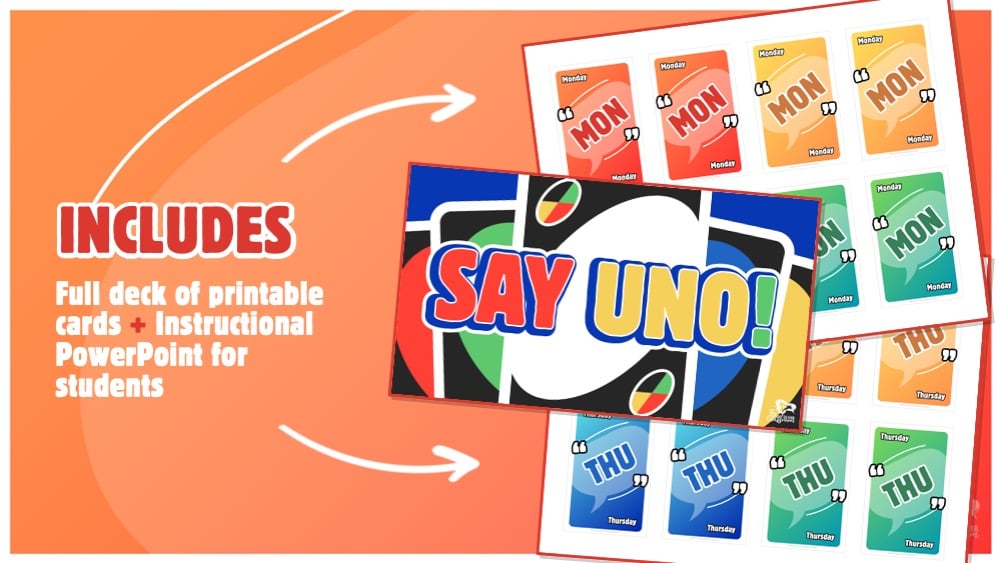 SAY UNO is an ESL spin on the classic card game! Use it as a fun, educational way to help students practice the days of the week and use them in everyday language.