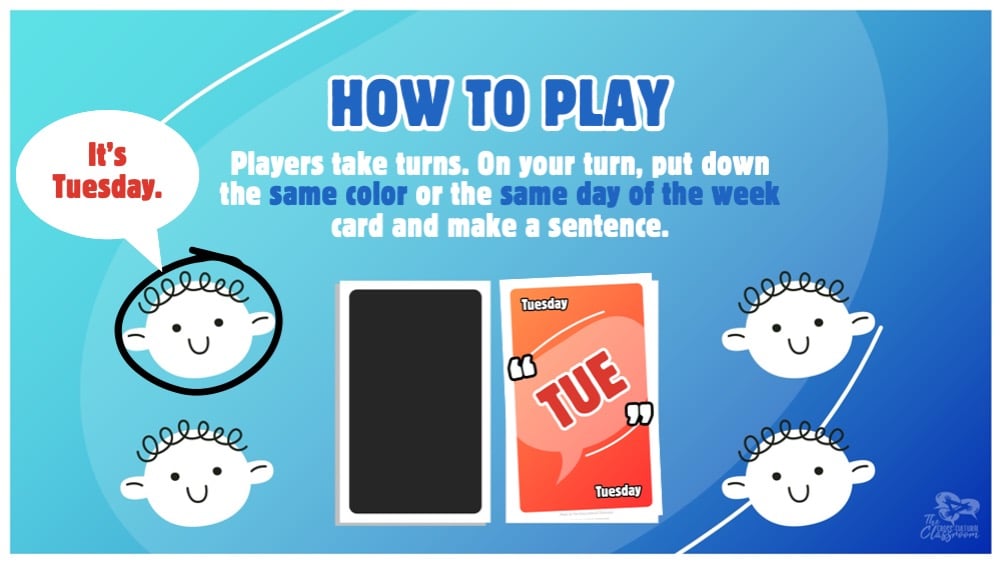 - On a player's turn, they put down the same color or day of the week card on the pile and say a sentence (i.e. "It's Tuesday.").