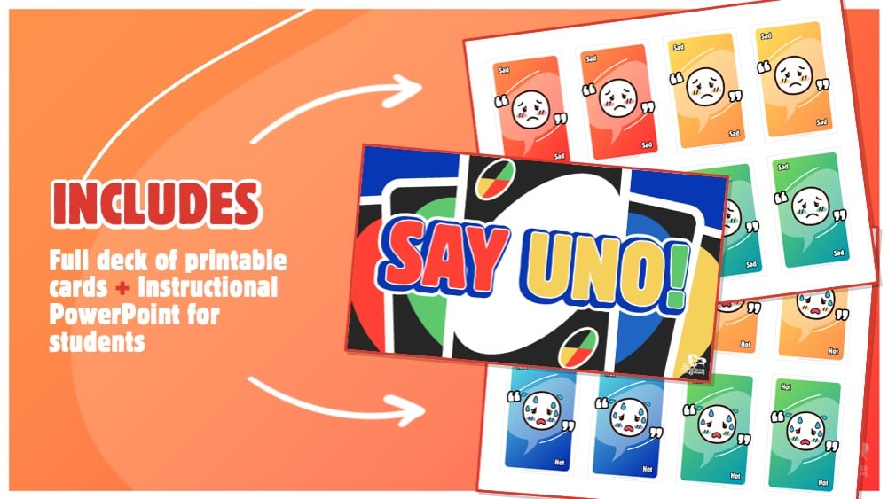SAY UNO is an ESL spin on the classic card game! Use it as a fun, educational way to help students practice feelings vocabulary and use them in everyday language.