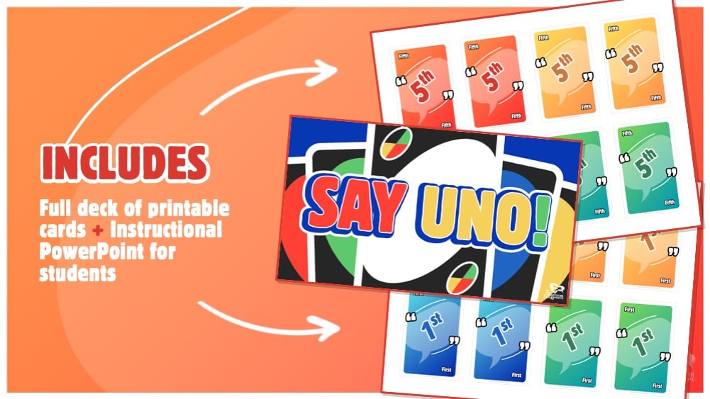 SAY UNO is an ESL spin on the classic card game! Use it as a fun, educational way to help students practice the ordinal numbers 1st-10th.